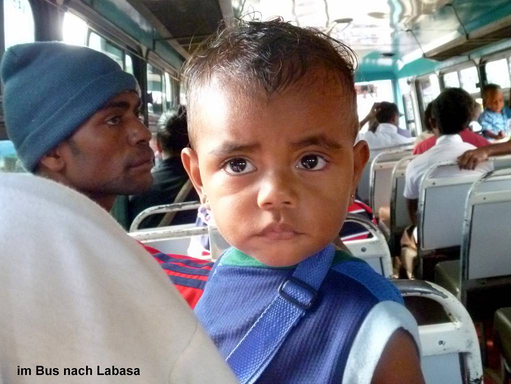 Bei der Rückfahrt sind wir total überfüllt. Und immer steigen noch mehr und noch mehr Leute ein, vor allem Schulkinder. Wir sitzen wie die Ölsardinen zusammen gedrängelt. Aber es ist interessant, die Leute zu beobachten. Ab ca.17h45 ist es dunkel und wir sehen gar nichts mehr. Später fängt es an zu regnen. Endlich haben wir es geschafft und kommen bei Regen beim Busplatz in Savusavu an.