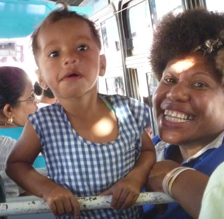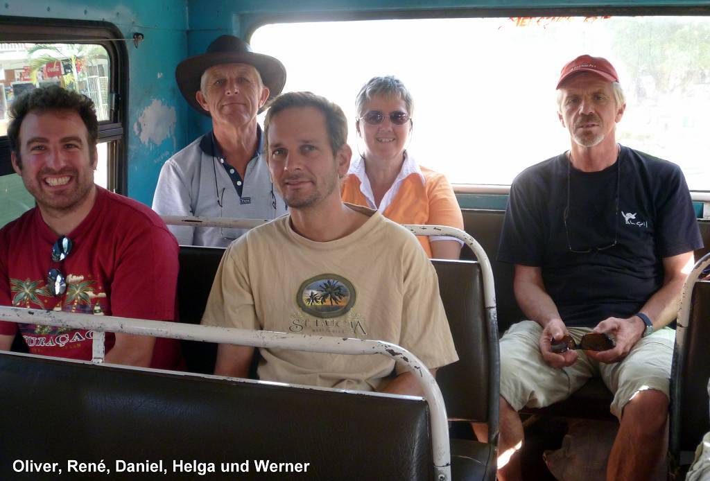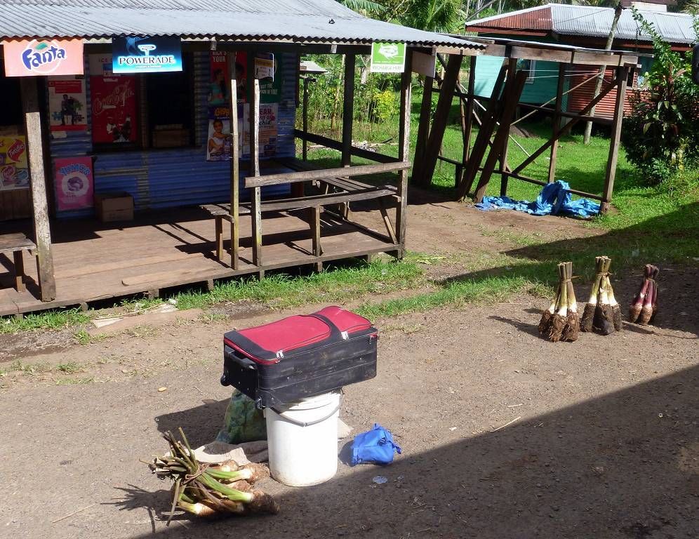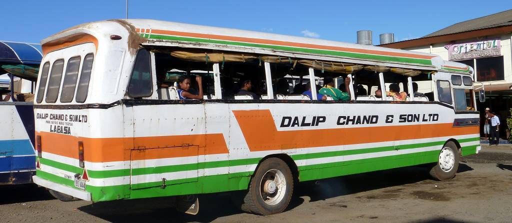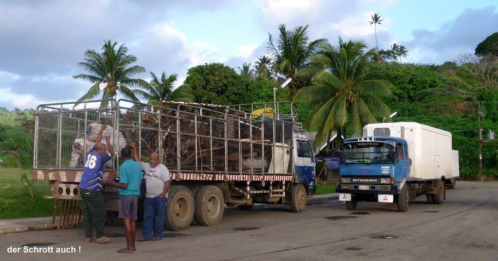 Unser erster Gang führt uns zu Vodafone. Oliver, Daniel und ich wollen ein FlashNet (Stick fürs Internet) kaufen, die sind ja in Savusavu total ausverkauft. Hier dauert das zwar ewig, aber es klappt immerhin einwandfrei. Jetzt geht es in ein Restaurant, wo wir alle zusammen ein gutes einheimisches Mittagessen verspeisen. Auch das dauert sehr lange bis es kommt, aber das macht nichts, es ist sehr gemütlich hier. Danach treffen wir uns alle wieder um 15h30 beim Busbahnhof. Kaum kommt der Bus, ist er schon fast wieder voll. Die 85 km lange Fahrt kostet 6.25 FJ$ (ca. 3.10 SFr.), komischerweise wollte der gleiche Fahrer heute morgen 8 FJ$ pro Person von uns haben. Der Bus ist ein Klapperkasten, der eigentlich ins Museum gehört. Paul meint, den würden sie nicht mal auf dem Schrottplatz nehmen...! Er, Paul, hat Horror, wenn er hört, wie der Fahrer die Gänge einmurkst und bei der kleinsten Steigung keucht der Bus mühsam dahin. Unterwegs muss der Fahrer noch Kühlwasser einfüllen, das er im Fluss holt. Wir kaufen unterdessen Bananen, etwa 8 Stück für 1 FJ$.