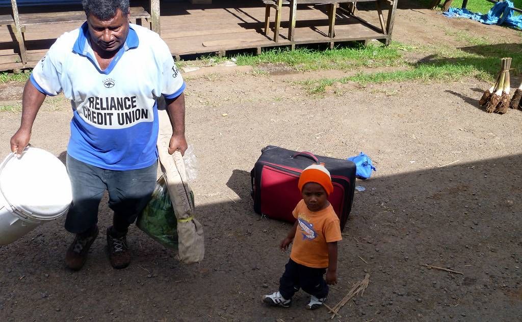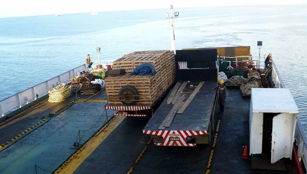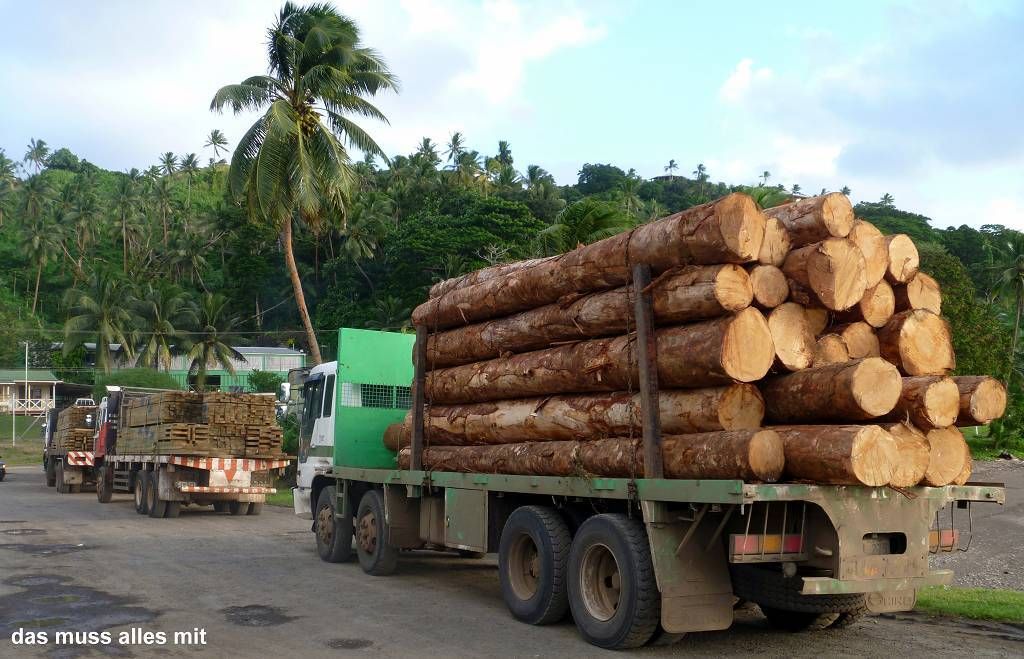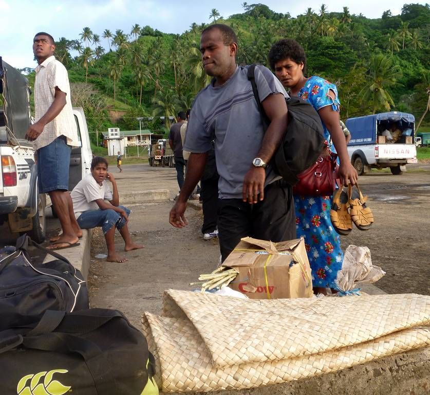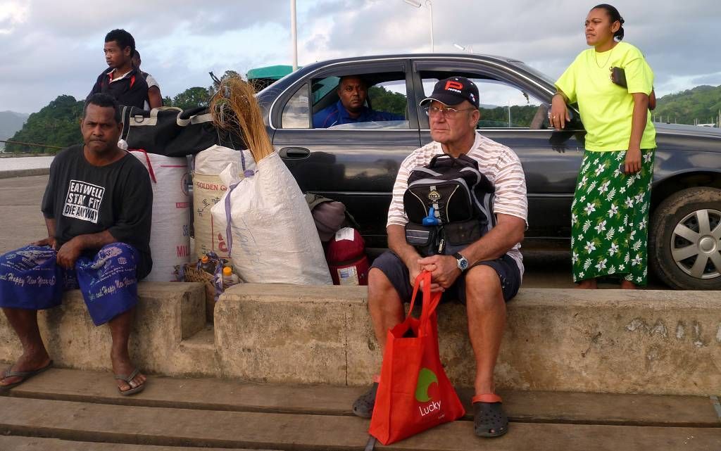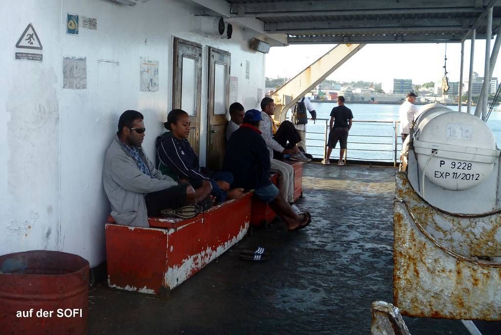 Um 17h müssen wir bei der Fähre sein. Aber das ist überhaupt nicht weit und wir laufen das kurze Stück. Die rote Fähre SOFI (Spirit of Fiji Islands) kommt kurz nach 17h an. Viele Leute warten schon. Zuerst werden viele Lastwagen, vor allem mit Holz (Stämmen und Brettern) und rostigem Schrott eingeladen. Danach dürfen wir Fussgänger einsteigen. Wir sind die einzigen Bleichgesichter auf dem ganzen Schiff. Um 19h legt die Fähre ab, Richtung Suva, mit einem Zwischenhalt auf der Insel Koro.
