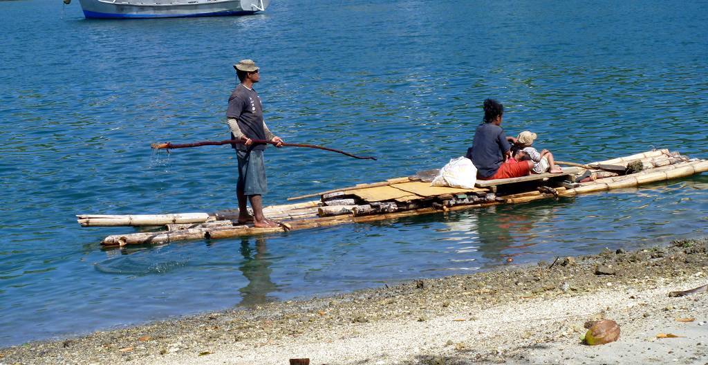 Im Nu haben wir Winfried und Bernd „verloren“! Aber das macht nichts, irgendwann werden die ja wohl wieder auftauchen. Und tatsächlich, nachdem wir etwa 30 Minuten bei den Dinghys gewartet haben, kommen sie gemütlich daher. Und während unserer Warterei konnten wir beobachten, wie die Einheimischen mit ihren Bambusflössen herumstaksen. Darauf befindet sich die Frau, winzige Babys und irgendwelche Lasten. Der Mann stakt.