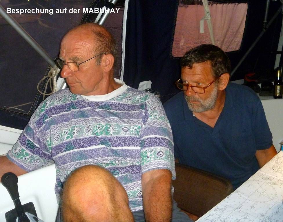Plötzlich wird es ein grösseres Essen als wir dachten. Elli und Bernd (Elbe), Daniel und Oliver (yellow dog) und Antje und Holger Freyja) sind auch da. Es wird ein schöner und gemütlicher Abend. Schweren Herzens verabschieden wir uns von den Seglerkollegen. Freyja's bringen uns um 21h zur MABUHAY zurück, weil unser Dinghy schon reisefertig aufgeladen ist.