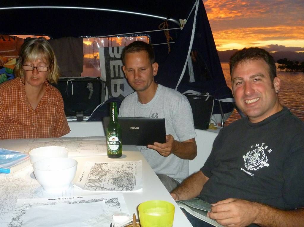 Oliver und Daniel versuchen unseren Wetterfax in Gang zu bringen. Diesen FURUNO-Wetterfax haben wir seit 8 Jahren (damals neu gekauft an der Interboot in Friedrichshafen). Und: er hat noch nie funktioniert! Daniel und Oliver sind beide gelernte Berufsleute in Sachen Elektro und Elektronik. Paul hat grosse Hoffnung, dass die beiden das Teil in Schwung bringen. Sie pröbeln geduldig unendlich lange an dem Ding herum, leider ohne Erfolg. Antje und Holger haben sich inzwischen verabschiedet. Um 20h30 kochen wir spontan Teigwaren mit Bolognese-Sauce und essen zu viert ein sehr spätes Nachtessen. Es ist wieder mal ein sehr gemütlicher Abend der bis 23h30 dauert.