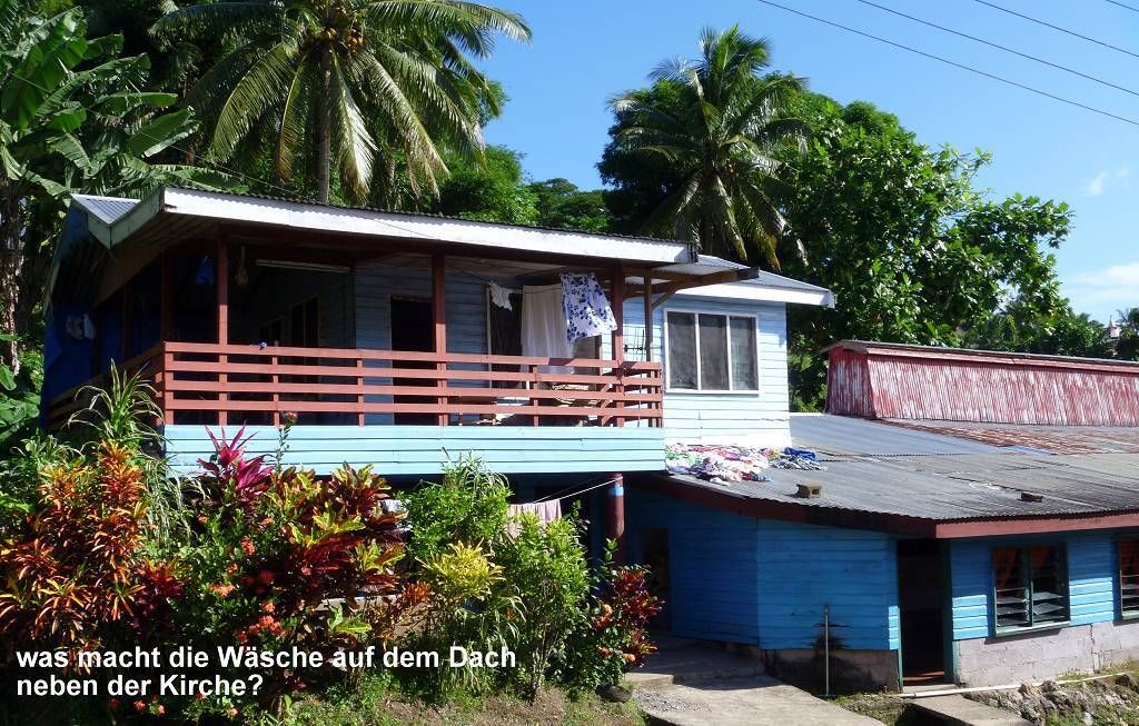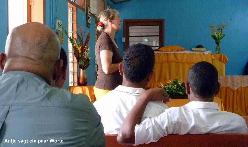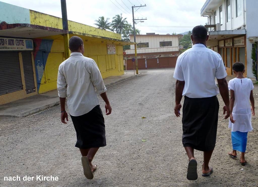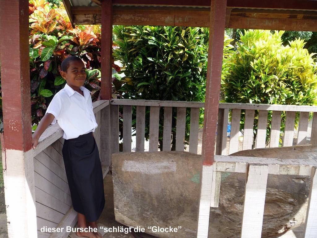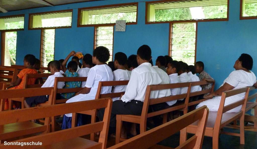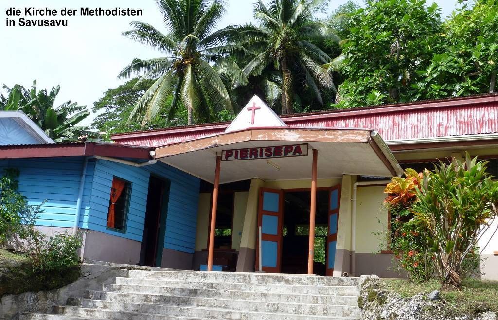 Antje und ich laufen um 9h30 durchs Dorf und gehen in die Methodisten-Kirche, die uns empfohlen wurde. Der Gottesdienst beginnt aber erst um 10h30 und so spazieren wir ein wenig herum. Dabei sehen wir einen Mungo. Schon von weitem hören wir die „Kirchenglocken“. Dies ist ein ausgehöhlter Stamm, auf den ein kleiner Junge mit Holzstöcken trommelt. Pünktlich sind wir wieder in der Kirche und werden sofort sehr freundlich persönlich von verschiedenen Leuten begrüsst. Man will unsere Namen wissen und woher wir kommen und entschuldigt sich, dass hier alles auf Fidschianisch gesprochen wird. Die Kinder, die vor dem Gottesdienst Sonntagsschule hatten, singen extra für uns das „Kumbayah“. Ist das nicht schön? Die Knaben und Männer tragen alle den Sulu, einen blauen oder schwarzen Rock, dazu ein weisses Hemd und die Erwachsenen eine Krawatte. Die meisten sind barfuss. Die Mädchen und Frauen, die meisten einen langen unifarbenen Rock und darüber ein Kleid, das bis zu den Knien oder Waden geht. Keine Hüte oder Blumen in den Haaren. Wir werden während des Gottesdienstes auf Englisch nochmals begrüsst und willkommen geheissen. Antje sagt ein paar Worte des Dankes auf Englisch.