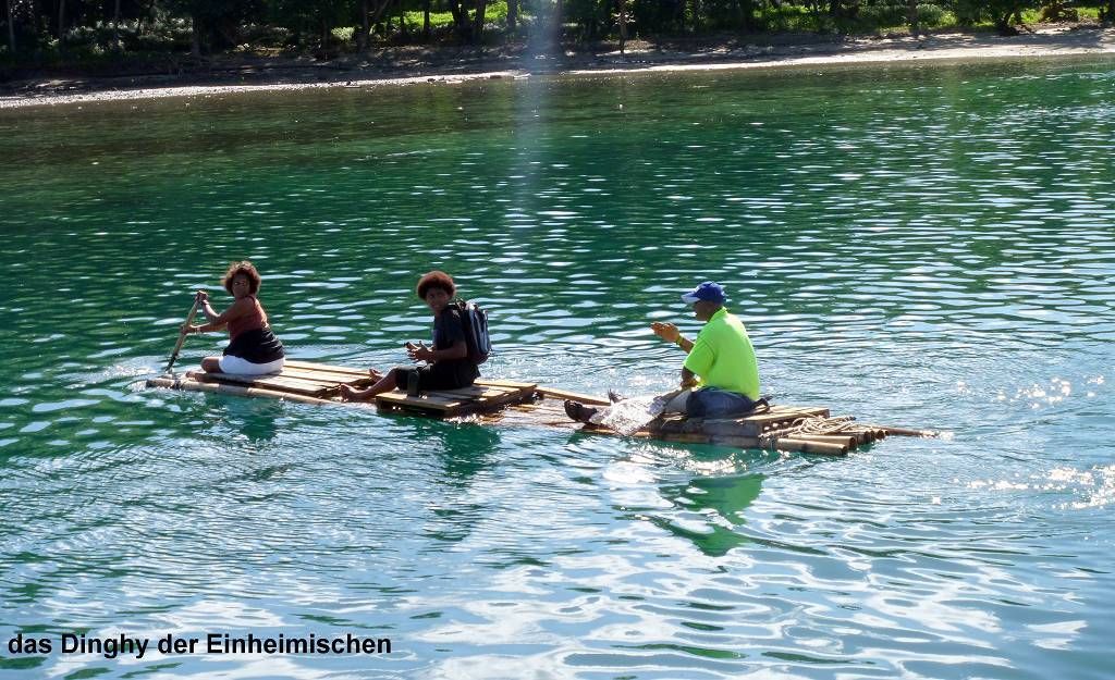 Im Nu haben wir Winfried und Bernd „verloren“! Aber das macht nichts, irgendwann werden die ja wohl wieder auftauchen. Und tatsächlich, nachdem wir etwa 30 Minuten bei den Dinghys gewartet haben, kommen sie gemütlich daher. Und während unserer Warterei konnten wir beobachten, wie die Einheimischen mit ihren Bambusflössen herumstaksen. Darauf befindet sich die Frau, winzige Babys und irgendwelche Lasten. Der Mann stakt.