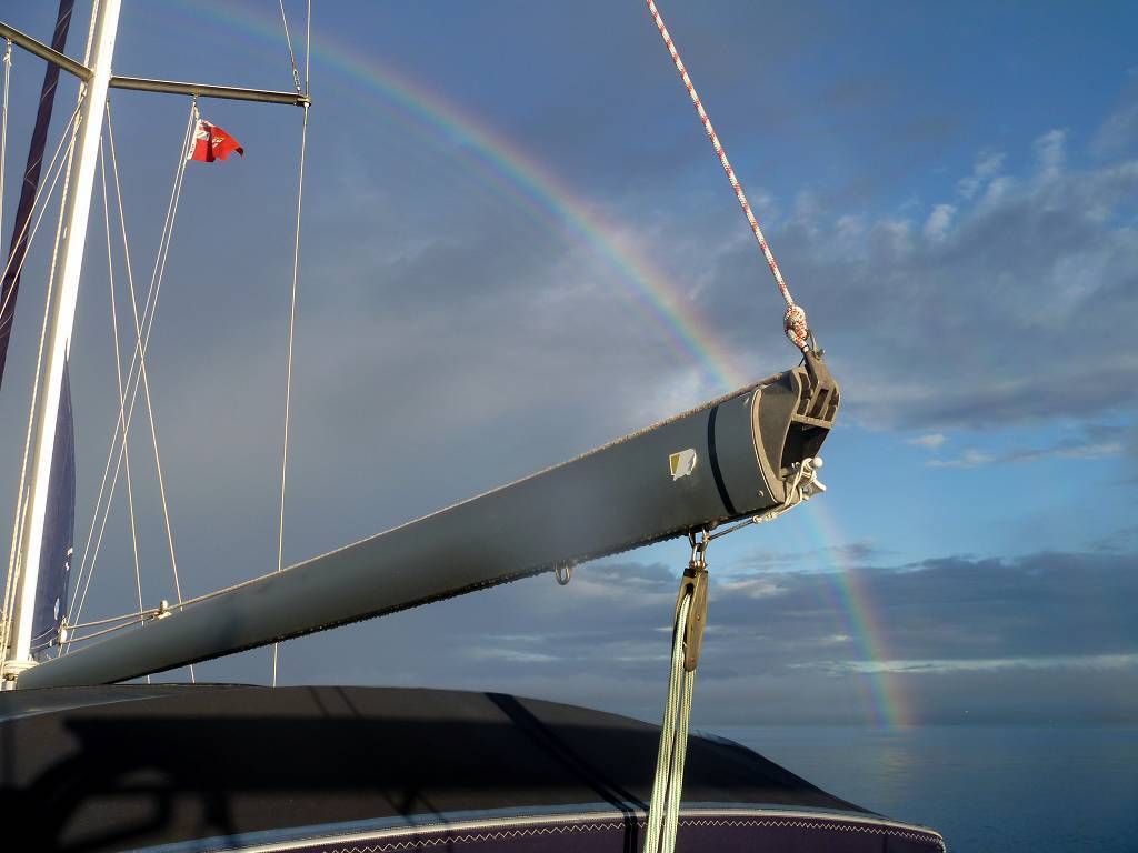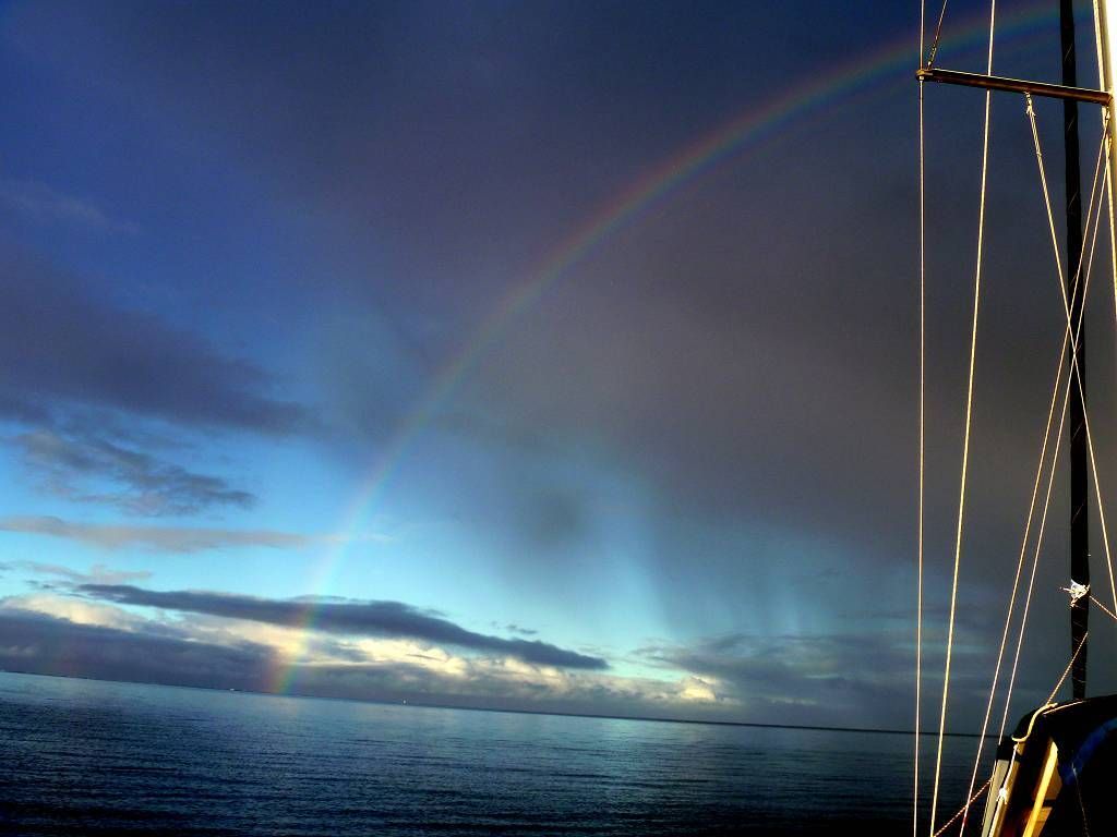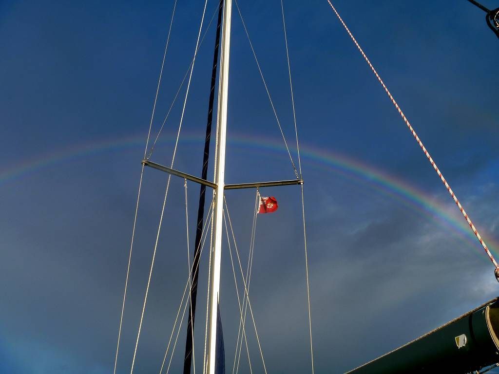 Um 7h fahren wir unter einem einmalig schönen, ganzen Regenbogen hindurch. So schön! Leider bringe ich den nicht ganz in den Fotoapparat hinein! Kurze Zeit später können wir im allerletzten Moment einem Fischernetz ausweichen, das Sperberauge Paul entdeckt hat. Es ist kein Wind da, wir motoren. Es ist bewölkt, mit blauen Himmelsabschnitten dazwischen. Gegen 11h passieren wir die von Paul so gefürchtete Nasonisoni-Passage. Die ist nur etwa 300m breit und führt ungefähr 2 sm (ca. 4km) lang zwischen zwei Riffen hindurch. Die Gegenströmung- und Wellen sind sehr stark und wir motoren kräftig dagegen an. Ehrlich gesagt, wir haben beide schon ein wenig beschleunigtes Herzklopfen, bis wir da durch sind. Jetzt ist es 100% bewölkt und nieselt. Aber alles geht gut und um 14h50 ankern wir vor dem Dorf Nabouwalu beim Cocoanut Point. Inzwischen ist es leicht bewölkt und wieder sonnig. Und: Sensation! Ich getraue mich seit Ewigkeiten (seit Tonga im Oktober) wieder einmal ins Meer zum Baden. Aber so schlecht ist das Fidschimeerwasser nämlich gar nicht. Im Gegenteil, es ist herrlich!!! Wir sind ganz alleine hier vor Anker. Nur hie und da braust ein kleines Fischerboot der Einheimischen vorbei.