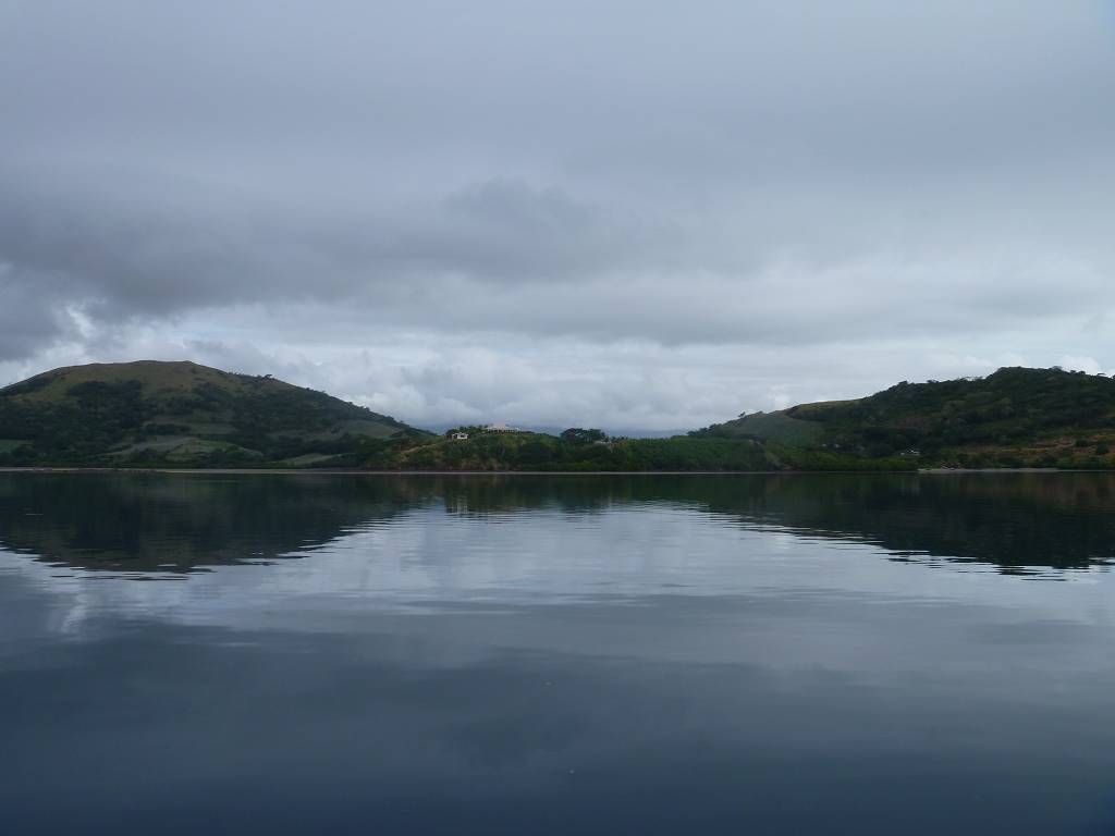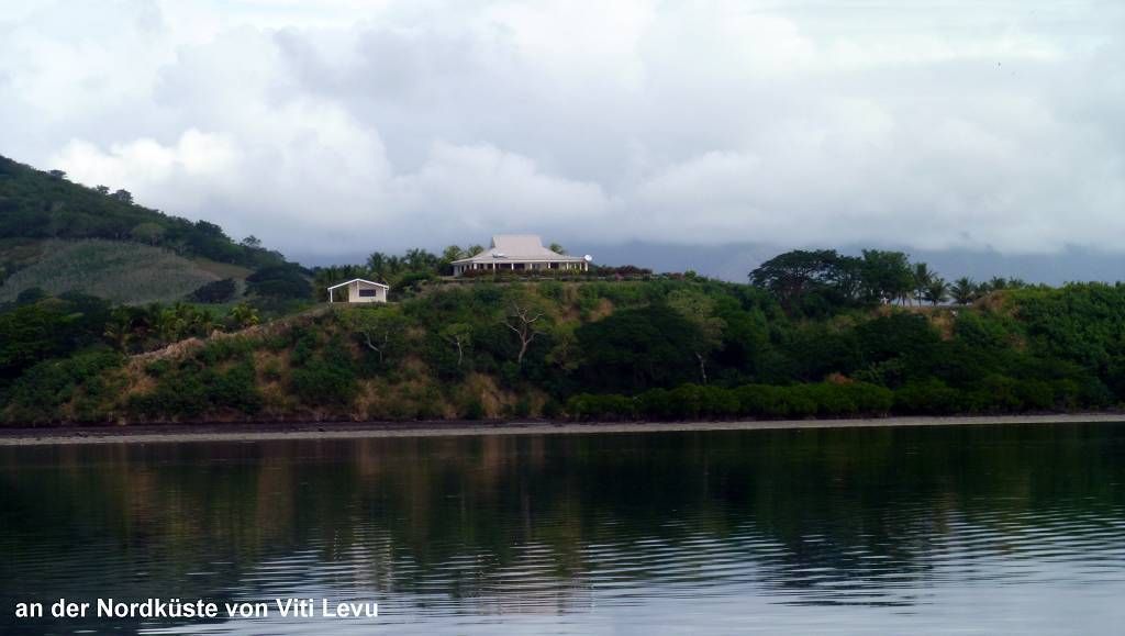 Nach einer Stunde können wir mit 10 Knoten Wind gemütlich segeln. Weil das Wasser fast ganz flach ist, können wir ganz ruhig mit etwa 4 Knoten Geschwindigkeit dahinsegeln. So entspannt und ruhig sind wir noch nie gesegelt. Wie auf Schienen. Nach 1½ Stunden ist das leider wieder vorbei und wir müssen wieder motoren. Und dafür regnet es jetzt. Nachdem wir die Nordküste von Viti Levu (Levu heisst gross) innerhalb des Riffgürtels erreicht haben, hört es auf zu regnen. Das Meer ist spiegelglatt, wie im Teich, mit blauen Himmelsspiegelungen im Wasser. Wunderschön! An den Hängen von Viti Levu hat es viele Zuckerrohrfelder und dazwischen vereinzelte Villen.
