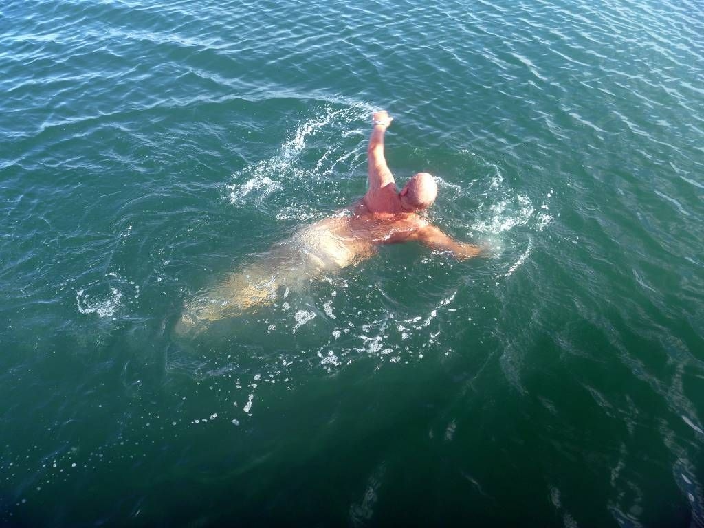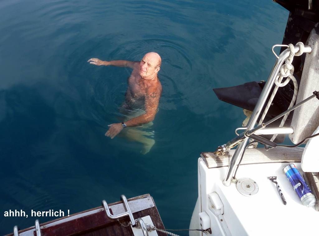 Weil so ein schöner Sonntagmorgen ist, nimmt Paul, bevor wir um 9h10 losmotoren, noch ein Bad im ruhigen Meerwasser.