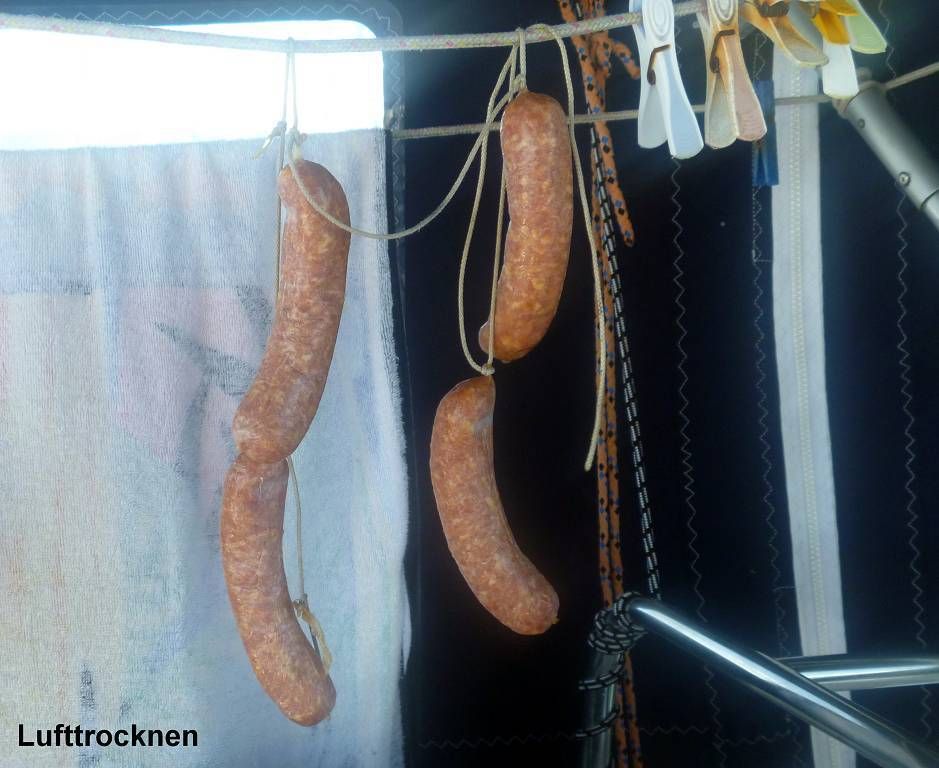 Wir holen die letzten vier „Knacker“-Würste vom deutschen Metzger in Neuseeland aus dem Tiefkühlfächli hervor und hängen sie zum Lufttrocknen auf. Wir haben festgestellt, dass sie so sehr viel besser schmecken.