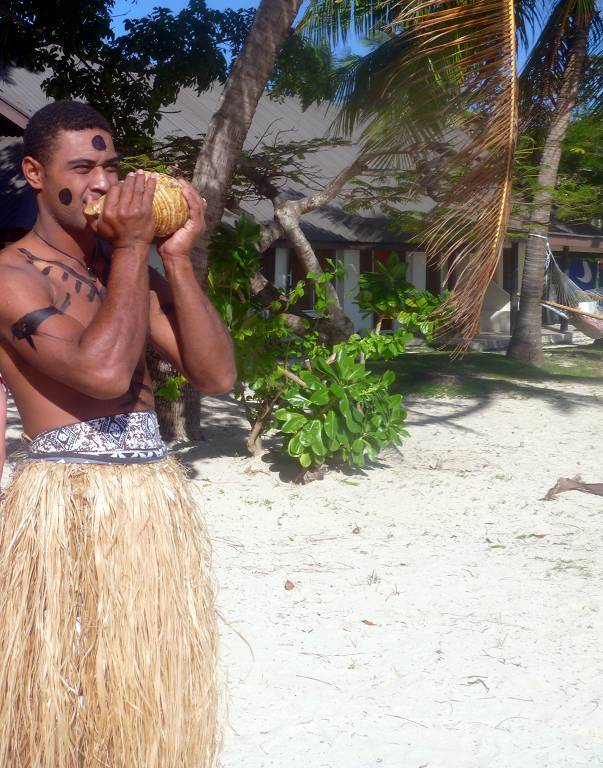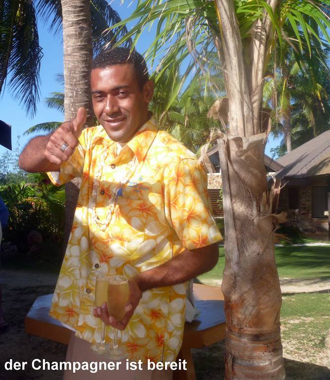 Unser Ziel ist die kleine Insel Malolo Lailai. Nachdem wir uns durch die verschiedenen Riffe „gezittert“ haben, ankern wir um 11h35 vor der Insel Malolo Lailai. Musket Cove ist ein beliebter Treffpunkt für Segler. Es hat schon etwa 25 Segelschiffe hier. Nach dem Mittagessen und Mittagsschläfchen vom Skipper (hat immer noch Rückenschmerzen), gehen wir an Land. Wir machen einen sehr langen Strandspaziergang. Die Insel ist zwar sehr schön, aber für unseren Geschmack, viel zu touristisch. Ein Hotel-Resort reiht sich ans andere. Beim Hotel Plantation treffen wir zufällig auf die Hochzeit eines australischen Paares. Ein kleiner Chor und „der Minister“ sind anwesend, dazu viele Gäste des Brautpaares. Während der Bräutigam und die Gäste in einem „Zelt“ am Strand warten, wird die Braut von 8 Fidschianern in „Tracht“ (Bastrock) in einem „Thron“ über den Strand zu ihrem Auserwählten getragen. Voran gehen die kleinen Brautjungfern. Das Ganze dauert 17 Minuten und danach sind die zwei verheiratet und bekommen ein Glas Champagner.