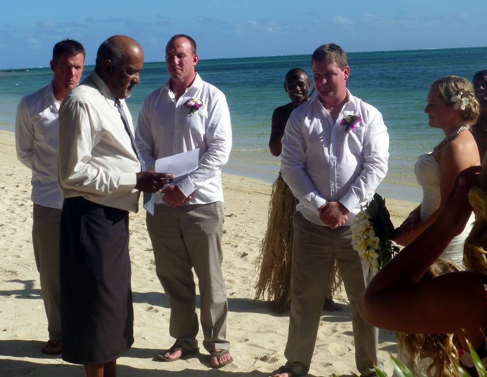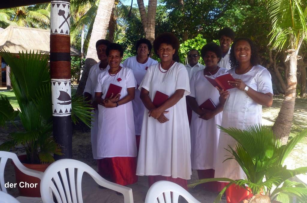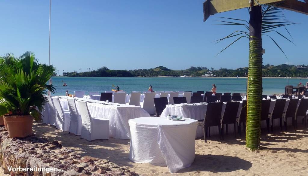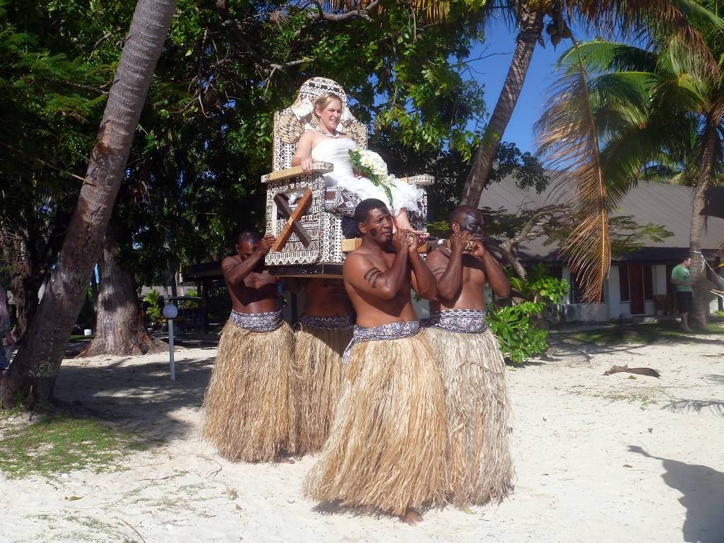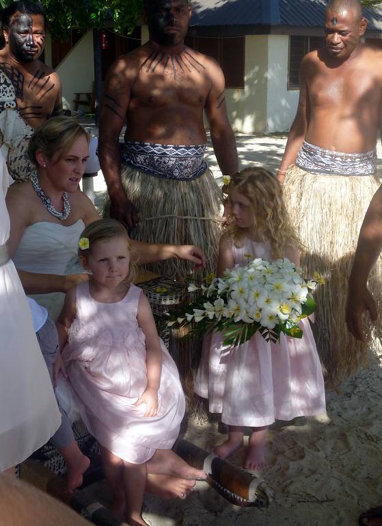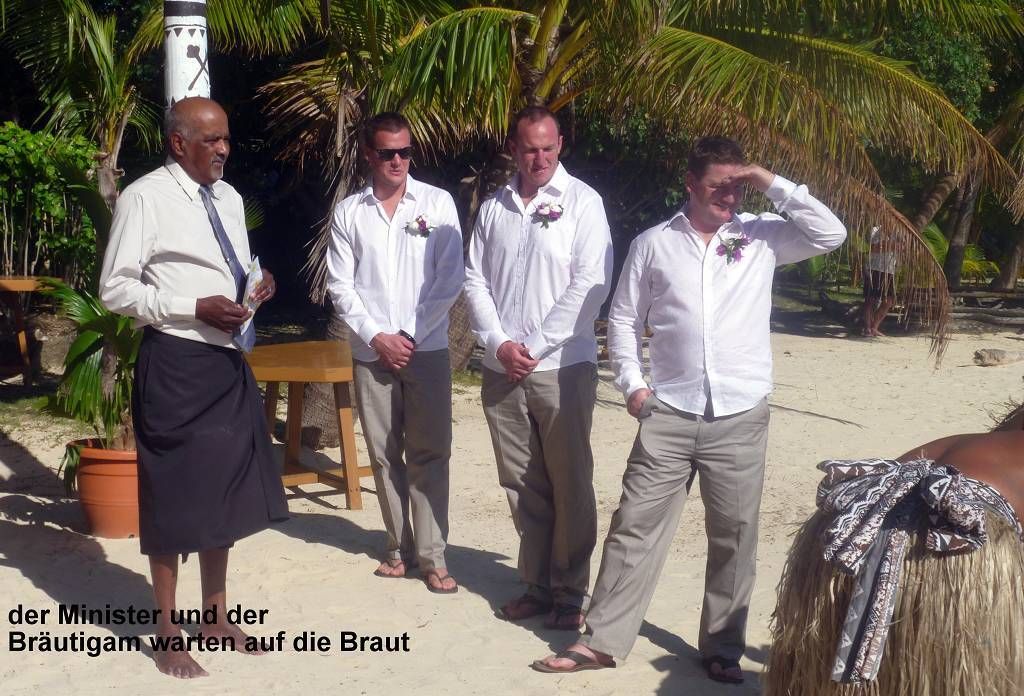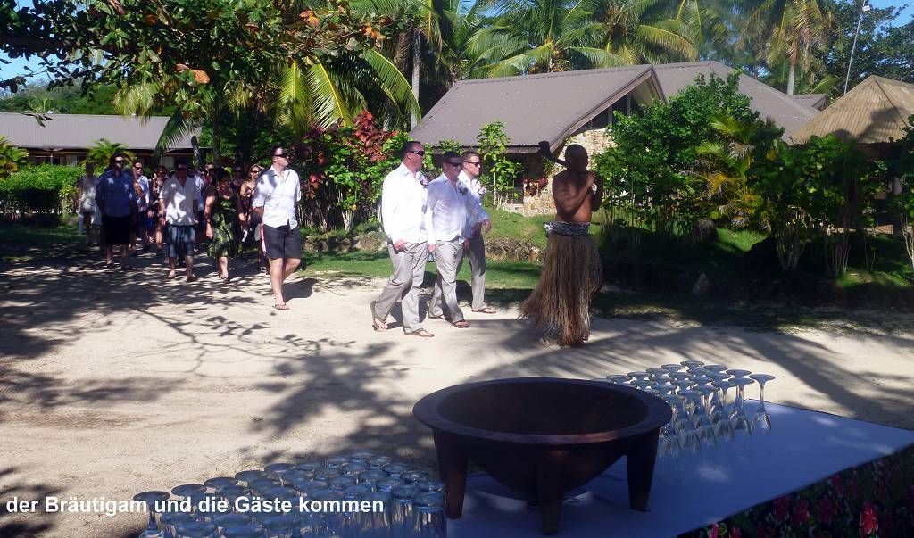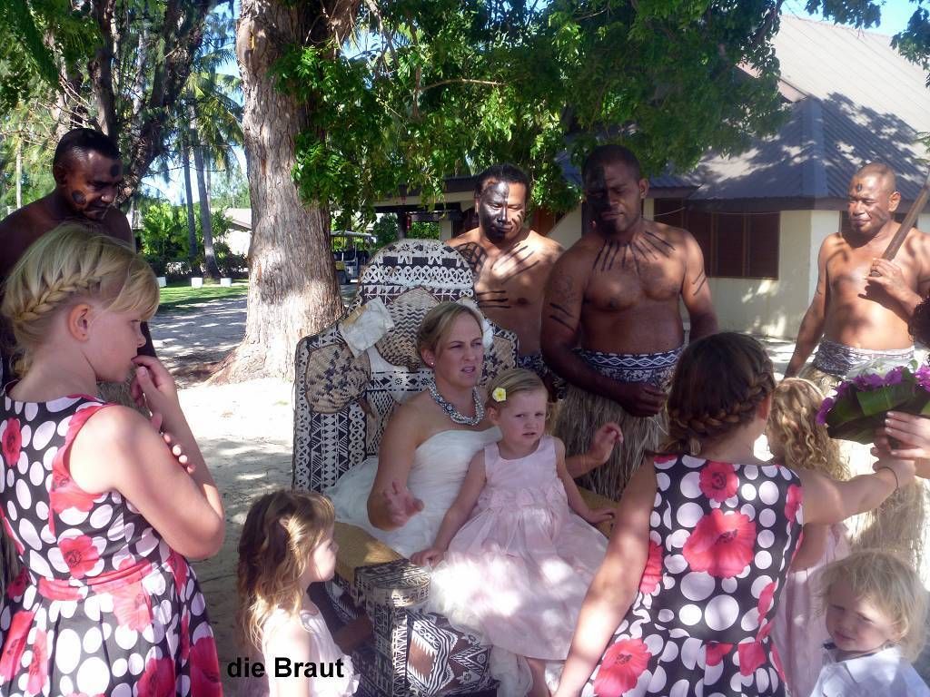 Unser Ziel ist die kleine Insel Malolo Lailai. Nachdem wir uns durch die verschiedenen Riffe „gezittert“ haben, ankern wir um 11h35 vor der Insel Malolo Lailai. Musket Cove ist ein beliebter Treffpunkt für Segler. Es hat schon etwa 25 Segelschiffe hier. Nach dem Mittagessen und Mittagsschläfchen vom Skipper (hat immer noch Rückenschmerzen), gehen wir an Land. Wir machen einen sehr langen Strandspaziergang. Die Insel ist zwar sehr schön, aber für unseren Geschmack, viel zu touristisch. Ein Hotel-Resort reiht sich ans andere. Beim Hotel Plantation treffen wir zufällig auf die Hochzeit eines australischen Paares. Ein kleiner Chor und „der Minister“ sind anwesend, dazu viele Gäste des Brautpaares. Während der Bräutigam und die Gäste in einem „Zelt“ am Strand warten, wird die Braut von 8 Fidschianern in „Tracht“ (Bastrock) in einem „Thron“ über den Strand zu ihrem Auserwählten getragen. Voran gehen die kleinen Brautjungfern. Das Ganze dauert 17 Minuten und danach sind die zwei verheiratet und bekommen ein Glas Champagner.