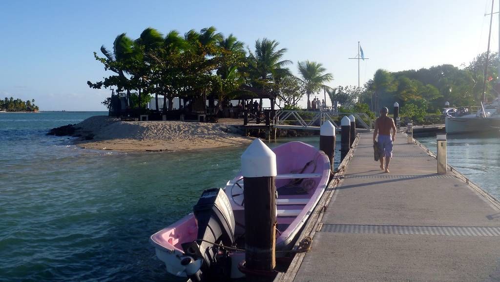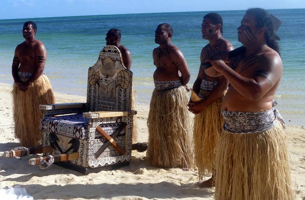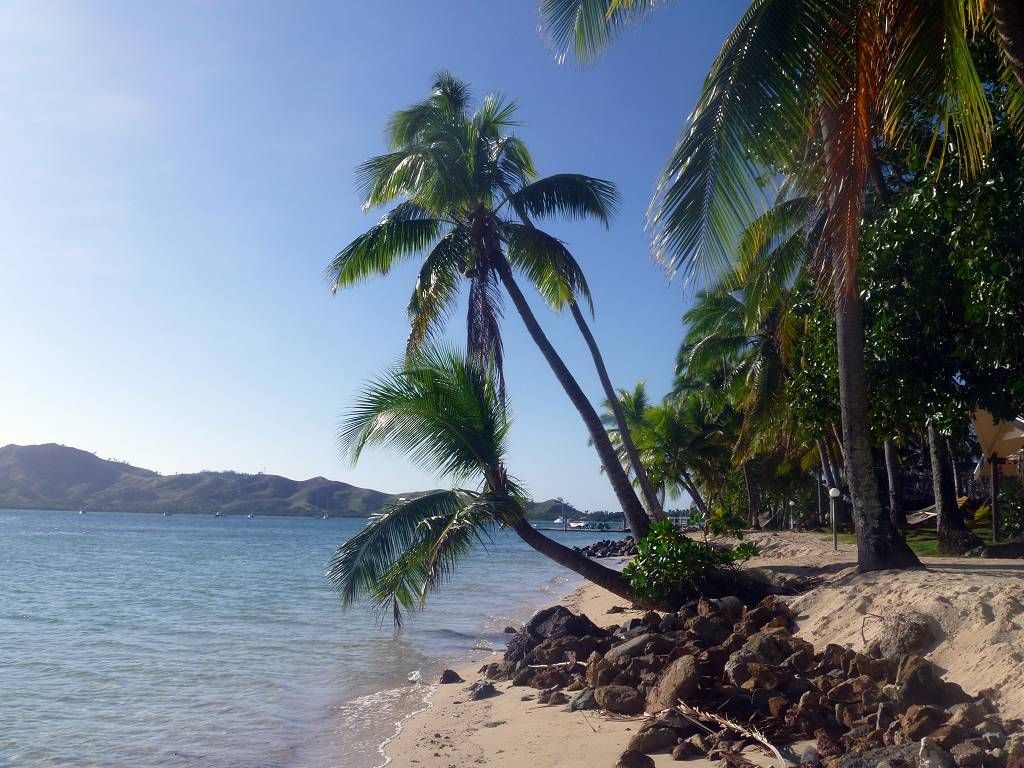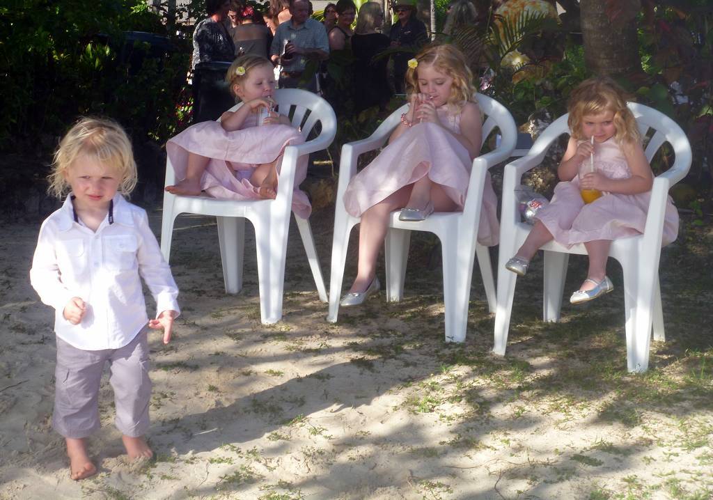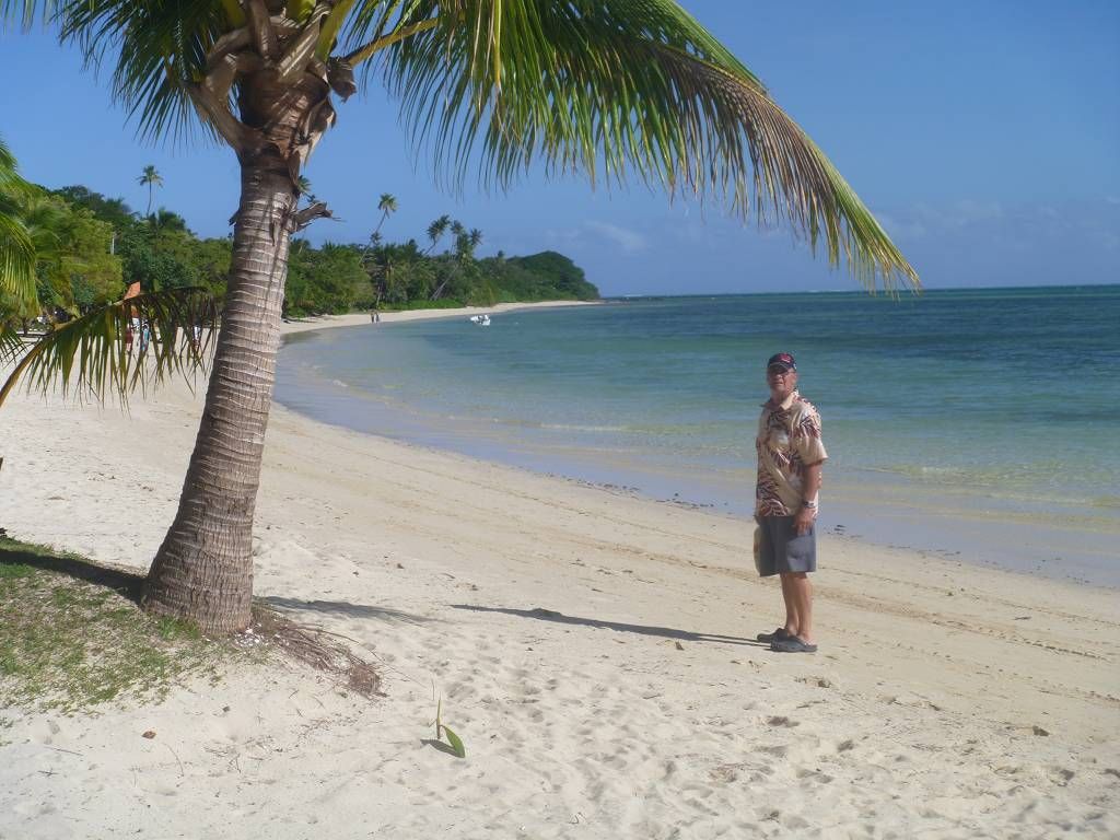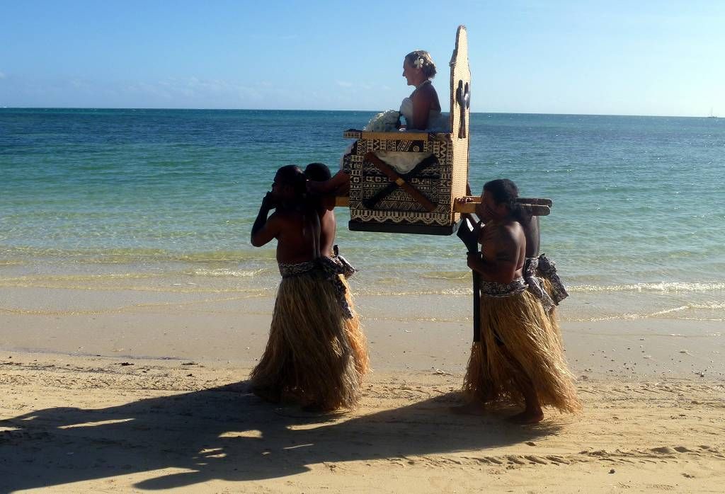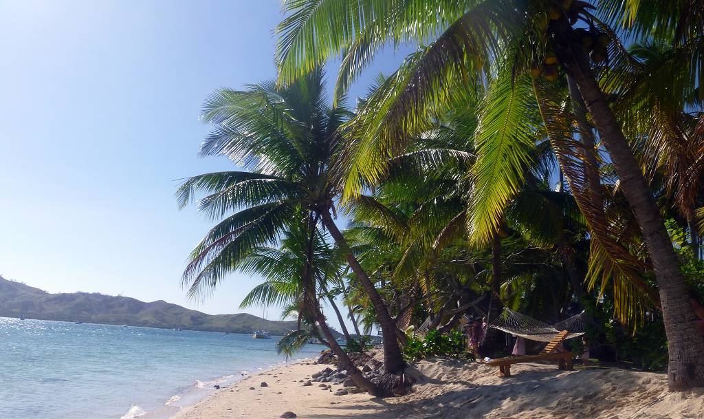 Unser Ziel ist die kleine Insel Malolo Lailai. Nachdem wir uns durch die verschiedenen Riffe „gezittert“ haben, ankern wir um 11h35 vor der Insel Malolo Lailai. Musket Cove ist ein beliebter Treffpunkt für Segler. Es hat schon etwa 25 Segelschiffe hier. Nach dem Mittagessen und Mittagsschläfchen vom Skipper (hat immer noch Rückenschmerzen), gehen wir an Land. Wir machen einen sehr langen Strandspaziergang. Die Insel ist zwar sehr schön, aber für unseren Geschmack, viel zu touristisch. Ein Hotel-Resort reiht sich ans andere. Beim Hotel Plantation treffen wir zufällig auf die Hochzeit eines australischen Paares. Ein kleiner Chor und „der Minister“ sind anwesend, dazu viele Gäste des Brautpaares. Während der Bräutigam und die Gäste in einem „Zelt“ am Strand warten, wird die Braut von 8 Fidschianern in „Tracht“ (Bastrock) in einem „Thron“ über den Strand zu ihrem Auserwählten getragen. Voran gehen die kleinen Brautjungfern. Das Ganze dauert 17 Minuten und danach sind die zwei verheiratet und bekommen ein Glas Champagner.