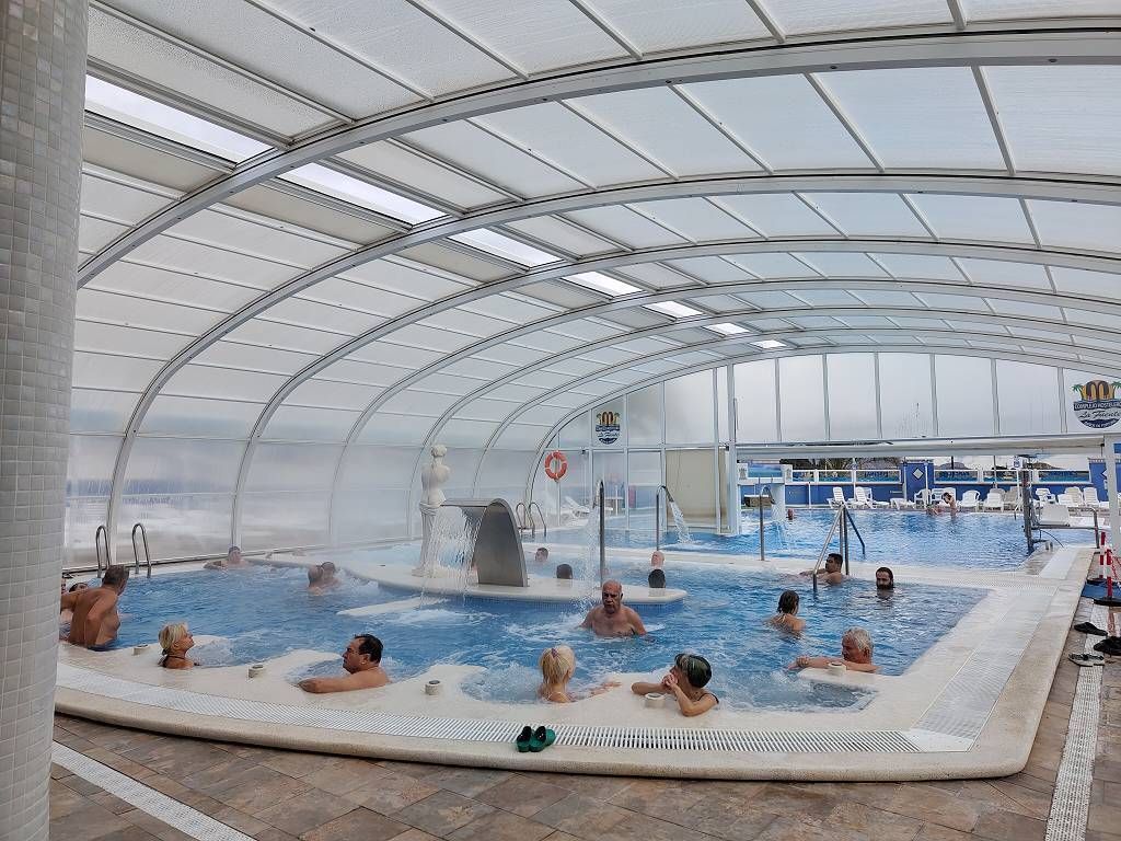 In der Nacht, gegen Morgen regnet es wieder, aber nur bis etwa 08h. Danach ist es ziemlich kalt und unfreundlich. Um 12h30 sind wir im Thermalbad. Aber heute sind wir nicht so begeistert wie gestern. Gestern waren wir 4 Personen in der hinteren Sprudelhalle. Heute hat es jede Menge Leute und es ist auch dementsprechend