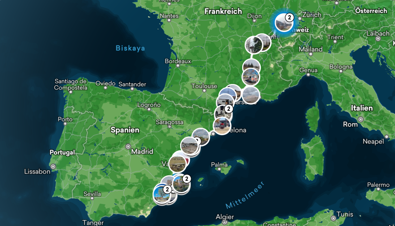 Wir waren 7 Wochen und ca. 3870km (8,5l Diesel/100km) unterwegs. Aber, auf dieser Winter-Spanien-Reise kamen nicht wirklich richtige Spanien-Ferien-Gefühle auf. Leider wollte das Wetter nicht so richtig mitspielen. Es gab sehr viele, zum Teil sehr intensive Regentage und es war kälter als wir das von Spanien im Winter kennen.