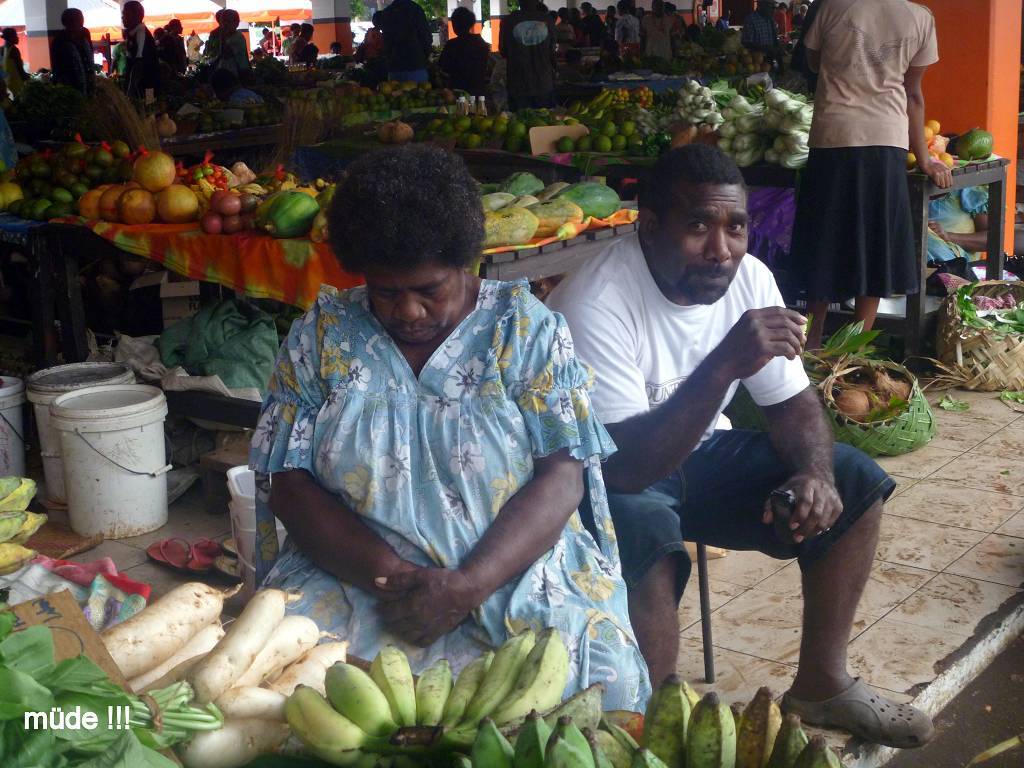 Wir waschen Wäsche, es regnet eine kurze Schütte und gegen Mittag sind wir wieder in der Markthalle. Da gibt es immer sehr viel Interessantes zu sehen. Auch jetzt schüttet es wieder und wir mussten in die Halle flüchten. Das Mittagessen besteht heute aus Reis (auch für Paul), Beef Steak für Paul, für mich Chicken und für beide viel verschiedenes gedämpftes Gemüse. Sehr gut für 400 Vatu. Es regnet in Strömen und wir spurten über die Strasse zur französischen Patisserie. Ich bekomme Kaffee und Tarte Framboise (Himbeerkuchen) und Paul 2 Kugeln Glacé in einem Glas.