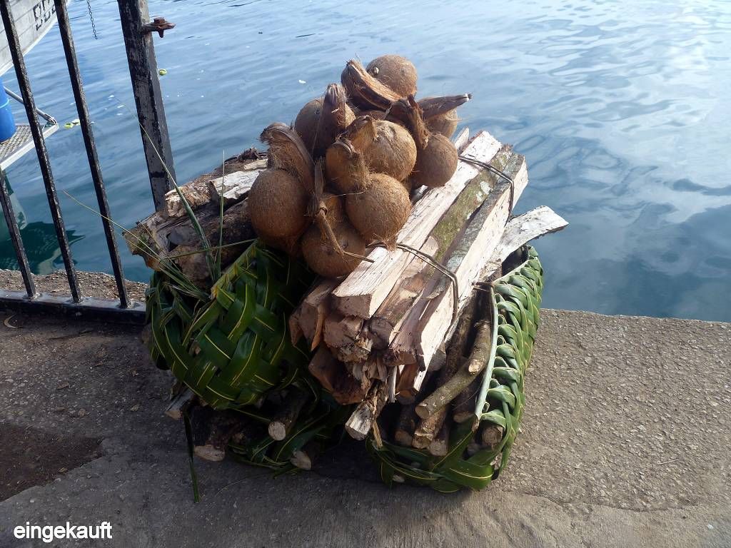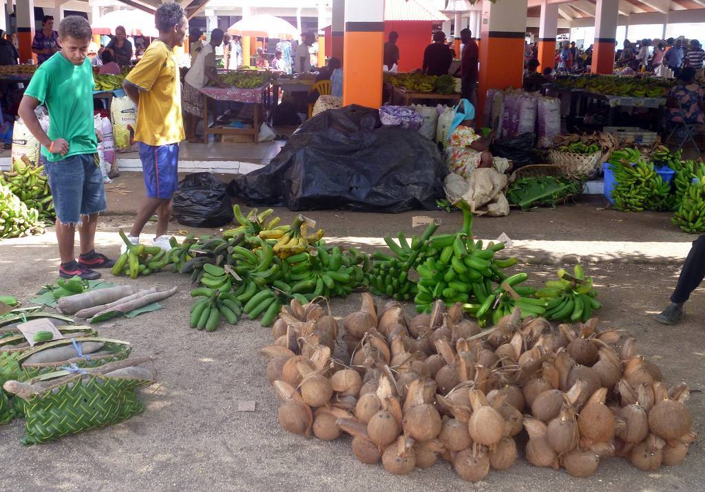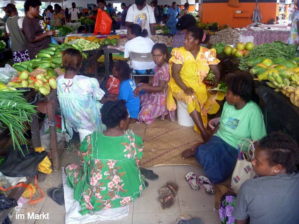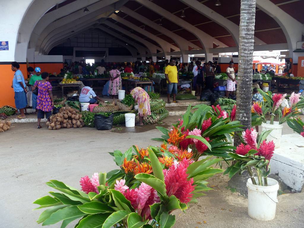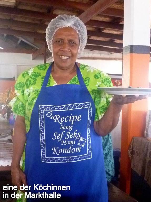 Wir waschen Wäsche, es regnet eine kurze Schütte und gegen Mittag sind wir wieder in der Markthalle. Da gibt es immer sehr viel Interessantes zu sehen. Auch jetzt schüttet es wieder und wir mussten in die Halle flüchten. Das Mittagessen besteht heute aus Reis (auch für Paul), Beef Steak für Paul, für mich Chicken und für beide viel verschiedenes gedämpftes Gemüse. Sehr gut für 400 Vatu. Es regnet in Strömen und wir spurten über die Strasse zur französischen Patisserie. Ich bekomme Kaffee und Tarte Framboise (Himbeerkuchen) und Paul 2 Kugeln Glacé in einem Glas.