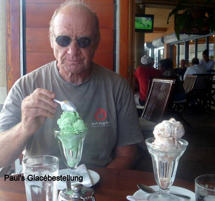 Wir gehen zur Tankstelle und kaufen 5 l Benzin fürs Dinghy. 1 Liter = 175 Vatu = 1.75 SFr. Und weil es immer noch mehr giesst, müssen wir nochmals in ein Restaurant flüchten. Paul kriegt 2 Kugeln Glacé und ich einen guten Kaffee. Pflotschnass sind wir um 15h wieder auf der MABUHAY.