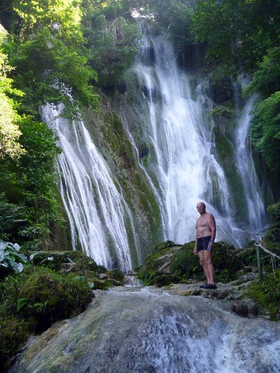 Nach dem Essen machen wir uns auf den Weg zum Wasserfall. Der Weg dauert etwa 20 Minuten und ist sehr schön angelegt. Zuoberst stürzt sich das Wasser in verschiedenen Fällen 20m in die Tiefe und wer will, kann sich darunter setzen. Das Wasser fliesst von Pool zu Pool und überall, wo man will, kann man sich hineinsetzen und baden. Einfach wunderschön und wir geniessen das Bad im kühlen Wasser. Nachdem wir wieder unten sind, baden wir nochmals in einem schönen Pool und lassen uns dann an der Sonne trocknen. Jetzt finden wir die 15'000 Vatu (15 SFr.) pro Person Eintritt nicht mehr zu viel. Alles ist sehr sauber und gut gemacht. Herrlich war's!