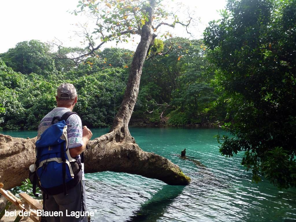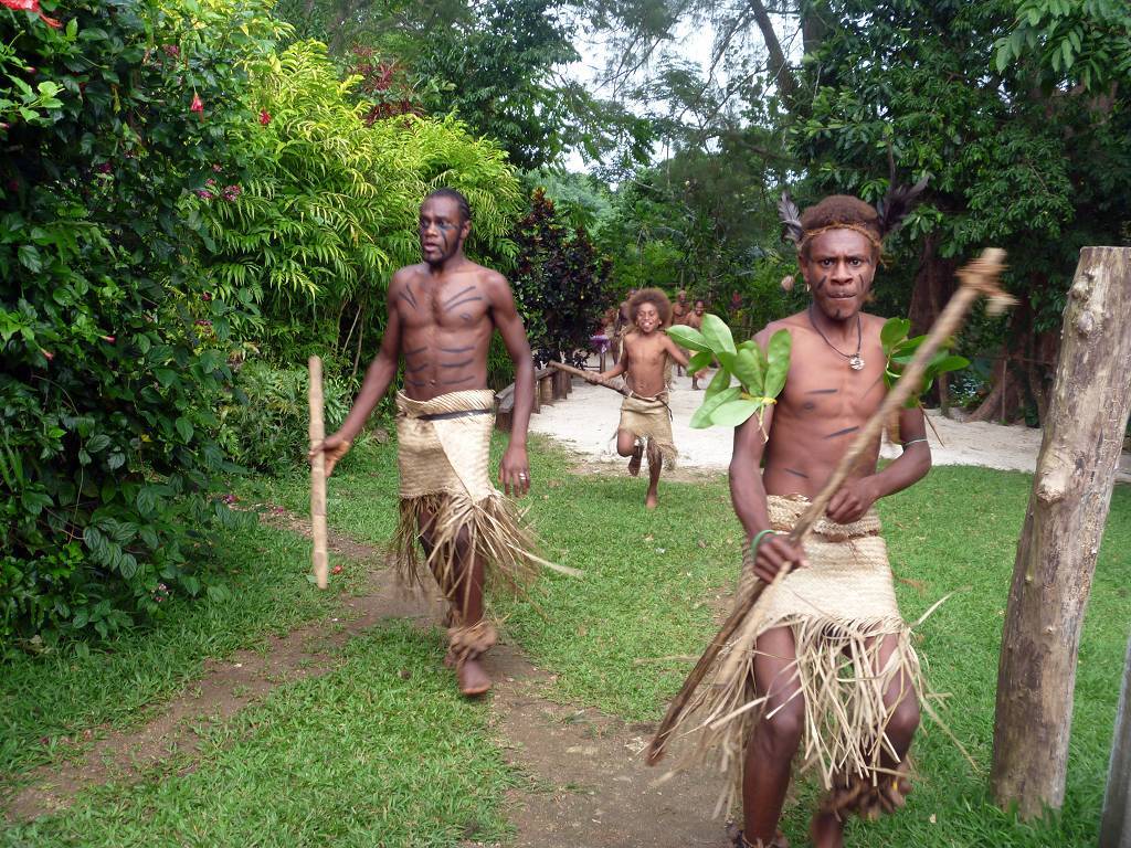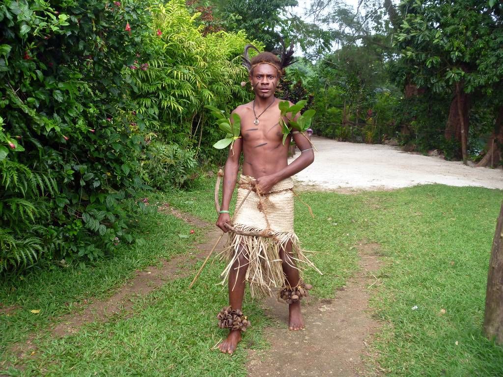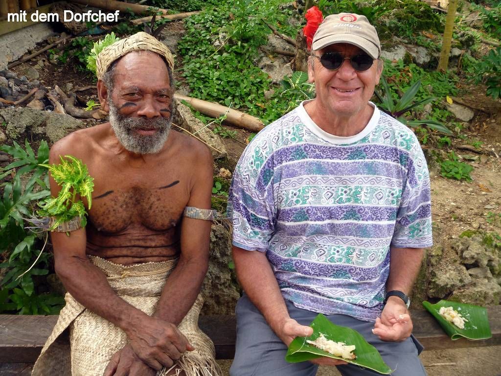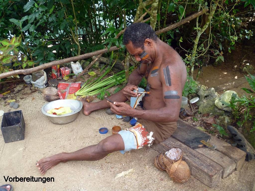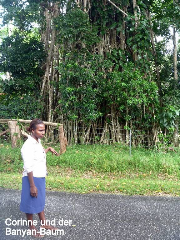 In der Nacht hat es wieder geregnet. Um 8h45 werden wir beim Souvenirladen, wo wir unsere Inselrundfahrt gebucht haben, bereits erwartet. Unser Minibus-Chauffeur, mit schöner gezöpfelter Frisur, heisst Micky und die Reiseleiterin Corinne. Bei einem Resort holen wir noch Colleen und Gino ab, ein Australisches Ehepaar aus Melbourne. Nun geht die Reise im Gegenuhrzeigersinn rund um die ganze Insel Efate los. In Vanuatu herrscht Rechtsverkehr. Paul und ich dürfen vorne neben Micky sitzen, deshalb sitzt Corinne hinter uns und knatscht ununterbrochen auf ihrem Kaugummi herum. Dabei lässt sie ständig Blasen platzen. Oh, wie ich das liebe! Aber sonst macht sie ihre Arbeit sehr gut! Sie erklärt uns sehr viel Wissenswertes über Pflanzen, die die Einheimischen als Medizin benutzen, über Bäume, besonders den grossen Banyanbaum, Früchte usw. Sie teilt uns auch mit, wohin jede der Seitenstrassen führt. Wir fahren über Brücken, die von den Japanern finanziert wurden. Eine halbe Stunde nach dem Start, gibt es schon die erste Pause. Wir sind bei der Blauen Lagune und dürfen hier im wirklich blauen Süsswasser schwimmen. Mich macht es zuerst gar nicht sehr an, um diese Zeit schon ins kalte Wasser zu hüpfen, aber es ist gar nicht so schlimm, im Gegenteil, herrlich. Nach dem Schwimmen gibt es Bananen, Grapefruits und für jeden eine Trinkkokosnuss. Weiter geht die Fahrt, durch grünen Busch und an einer verlassenen Magnesium-Mine vorbei, wo noch die alten Maschinen vor sich hinrosten. Wir steigen irgendwo aus und laufen durch ein Dörfchen. Corinne zeigt uns die von Australien erbauten Schulen. Sie erklärt uns auch, dass man in Vanuatu die "Flying Fox" (Fledermäuse) isst. Um 11h sind wir in einem kleinen Dorf, wo wir von bemalten Kriegern mit Geschrei empfangen werden. Die führen für uns ein paar kleine Kriegs- und Friedenstänze auf und danach dürfen wir das Essen, das im Erdofen, auf glühenden Lavasteinen, in Bananenblättern eingewickelt, gekocht wurde. Das heisst Laplap. Es sind verschiedene Gemüse mit Kokosmilch darüber. Mmm.., einfach nur köstlich!!!