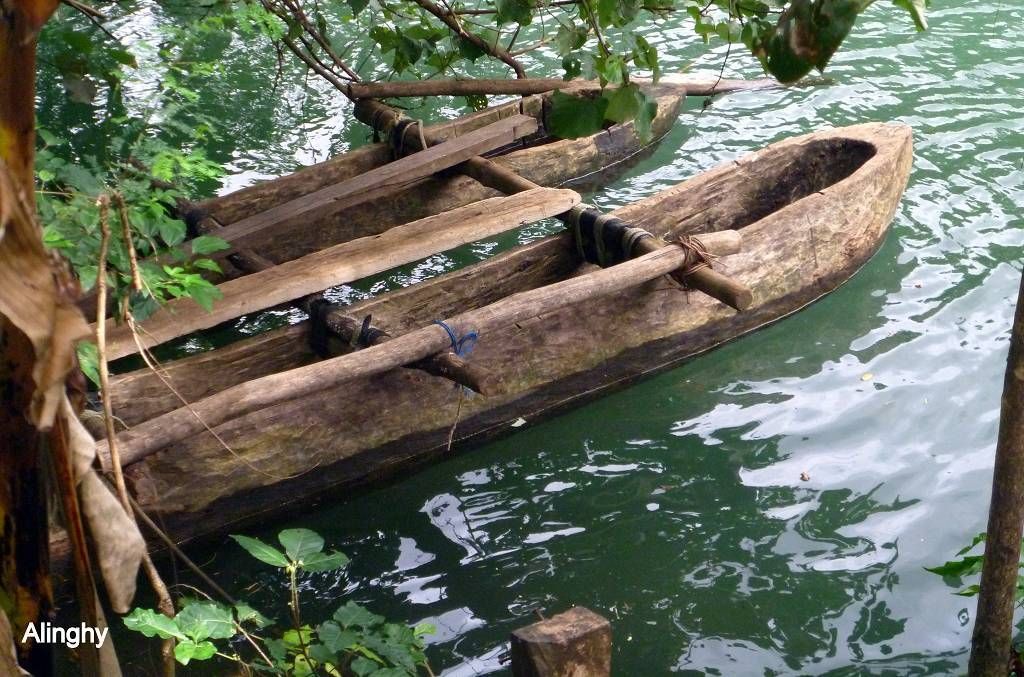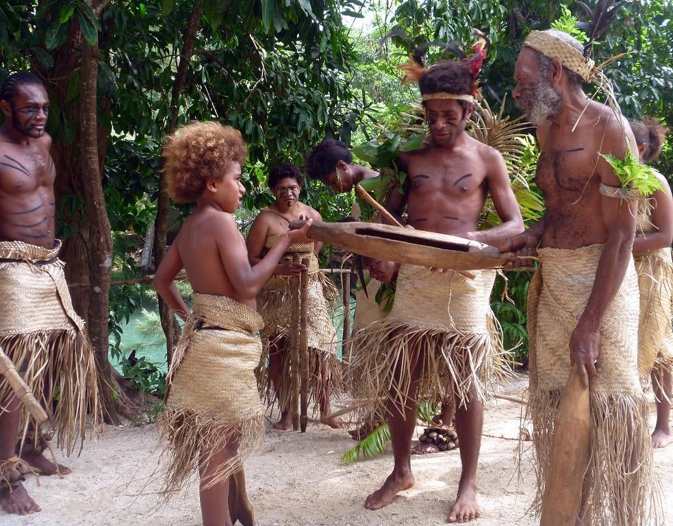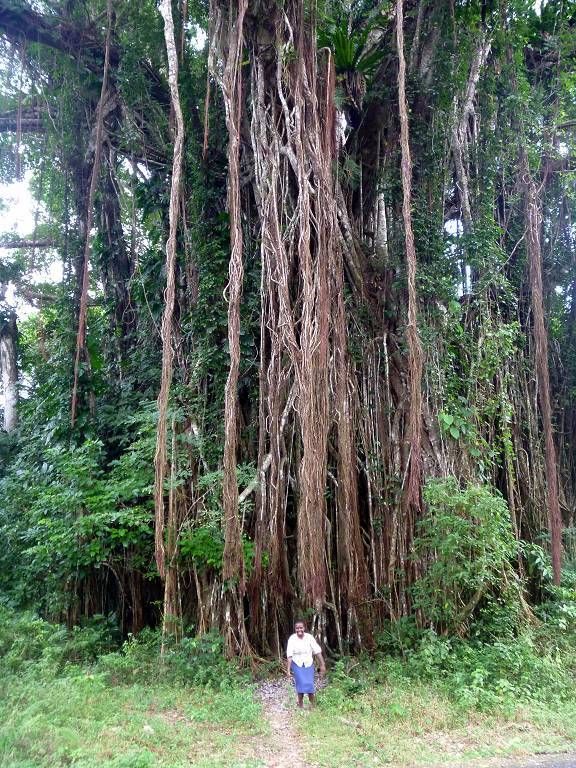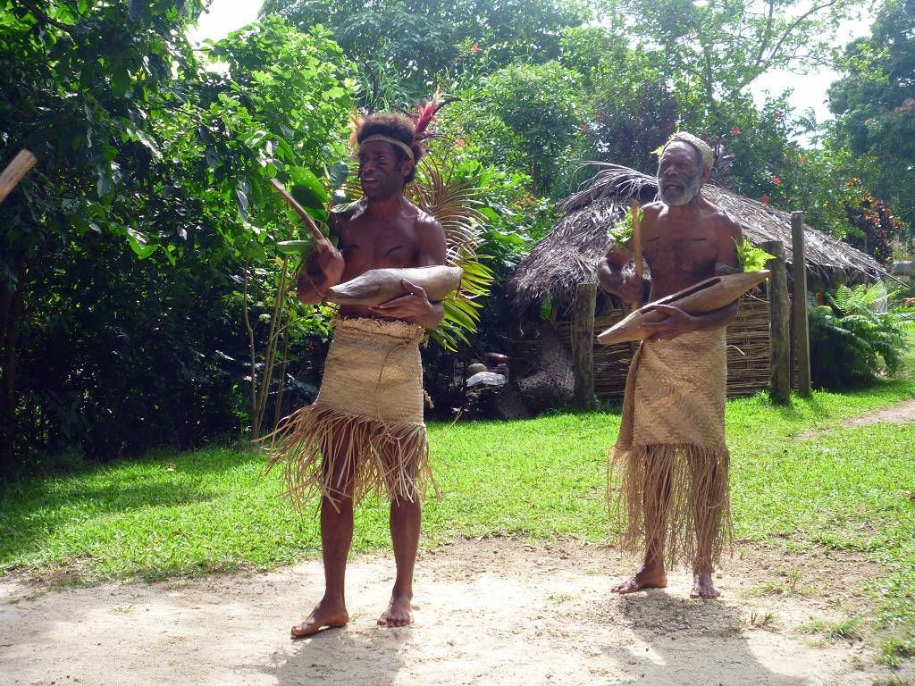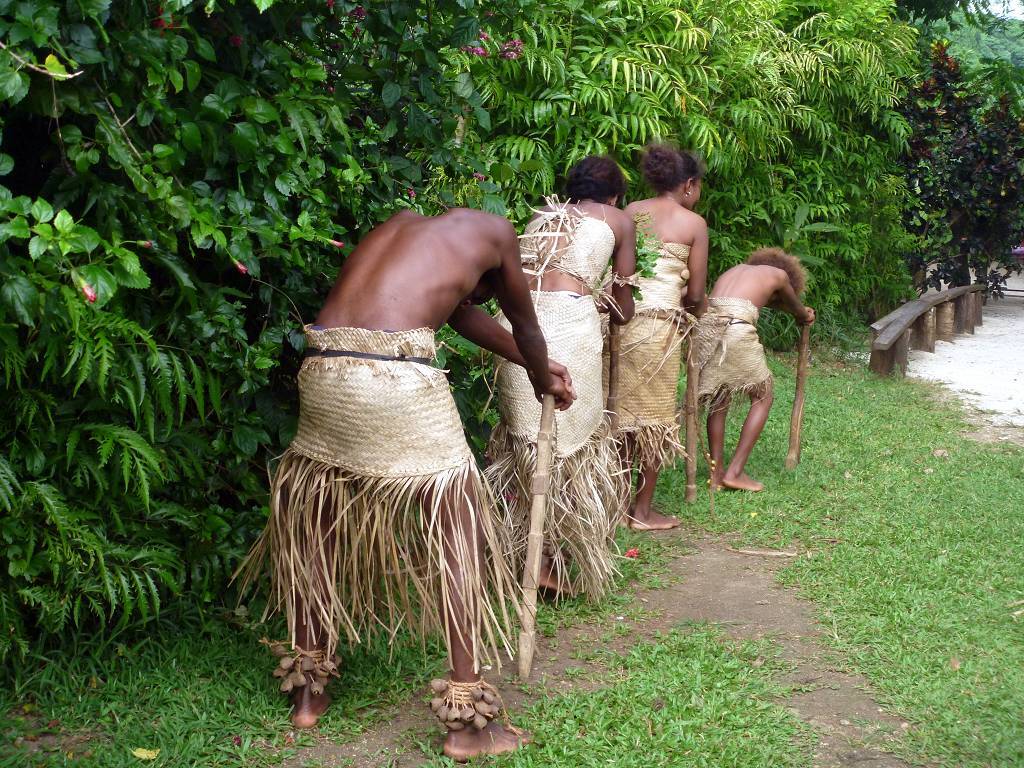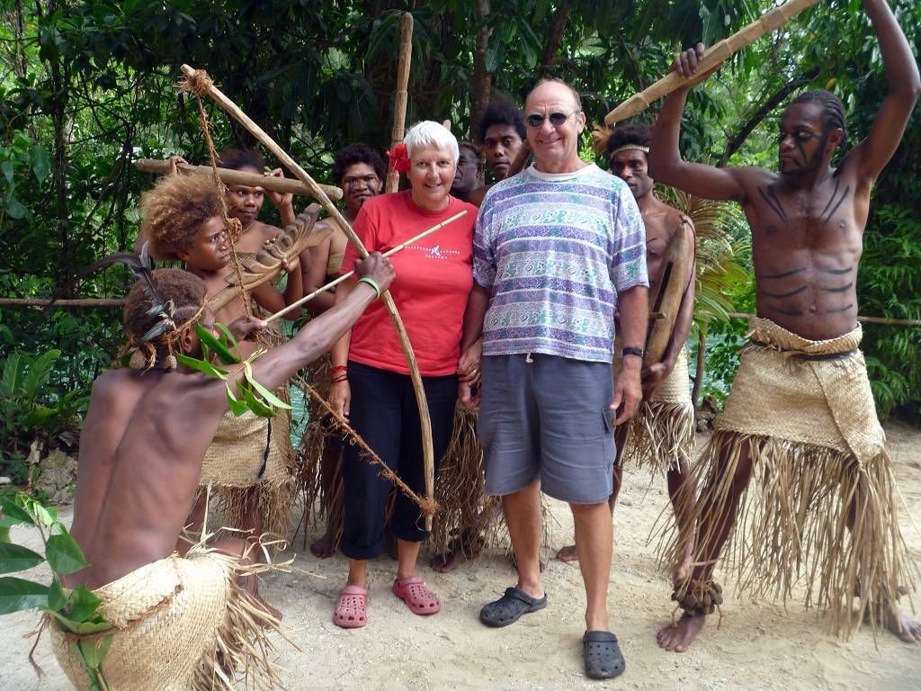 In der Nacht hat es wieder geregnet. Um 8h45 werden wir beim Souvenirladen, wo wir unsere Inselrundfahrt gebucht haben, bereits erwartet. Unser Minibus-Chauffeur, mit schöner gezöpfelter Frisur, heisst Micky und die Reiseleiterin Corinne. Bei einem Resort holen wir noch Colleen und Gino ab, ein Australisches Ehepaar aus Melbourne. Nun geht die Reise im Gegenuhrzeigersinn rund um die ganze Insel Efate los. In Vanuatu herrscht Rechtsverkehr. Paul und ich dürfen vorne neben Micky sitzen, deshalb sitzt Corinne hinter uns und knatscht ununterbrochen auf ihrem Kaugummi herum. Dabei lässt sie ständig Blasen platzen. Oh, wie ich das liebe! Aber sonst macht sie ihre Arbeit sehr gut! Sie erklärt uns sehr viel Wissenswertes über Pflanzen, die die Einheimischen als Medizin benutzen, über Bäume, besonders den grossen Banyanbaum, Früchte usw. Sie teilt uns auch mit, wohin jede der Seitenstrassen führt. Wir fahren über Brücken, die von den Japanern finanziert wurden. Eine halbe Stunde nach dem Start, gibt es schon die erste Pause. Wir sind bei der Blauen Lagune und dürfen hier im wirklich blauen Süsswasser schwimmen. Mich macht es zuerst gar nicht sehr an, um diese Zeit schon ins kalte Wasser zu hüpfen, aber es ist gar nicht so schlimm, im Gegenteil, herrlich. Nach dem Schwimmen gibt es Bananen, Grapefruits und für jeden eine Trinkkokosnuss. Weiter geht die Fahrt, durch grünen Busch und an einer verlassenen Magnesium-Mine vorbei, wo noch die alten Maschinen vor sich hinrosten. Wir steigen irgendwo aus und laufen durch ein Dörfchen. Corinne zeigt uns die von Australien erbauten Schulen. Sie erklärt uns auch, dass man in Vanuatu die "Flying Fox" (Fledermäuse) isst. Um 11h sind wir in einem kleinen Dorf, wo wir von bemalten Kriegern mit Geschrei empfangen werden. Die führen für uns ein paar kleine Kriegs- und Friedenstänze auf und danach dürfen wir das Essen, das im Erdofen, auf glühenden Lavasteinen, in Bananenblättern eingewickelt, gekocht wurde. Das heisst Laplap. Es sind verschiedene Gemüse mit Kokosmilch darüber. Mmm.., einfach nur köstlich!!!