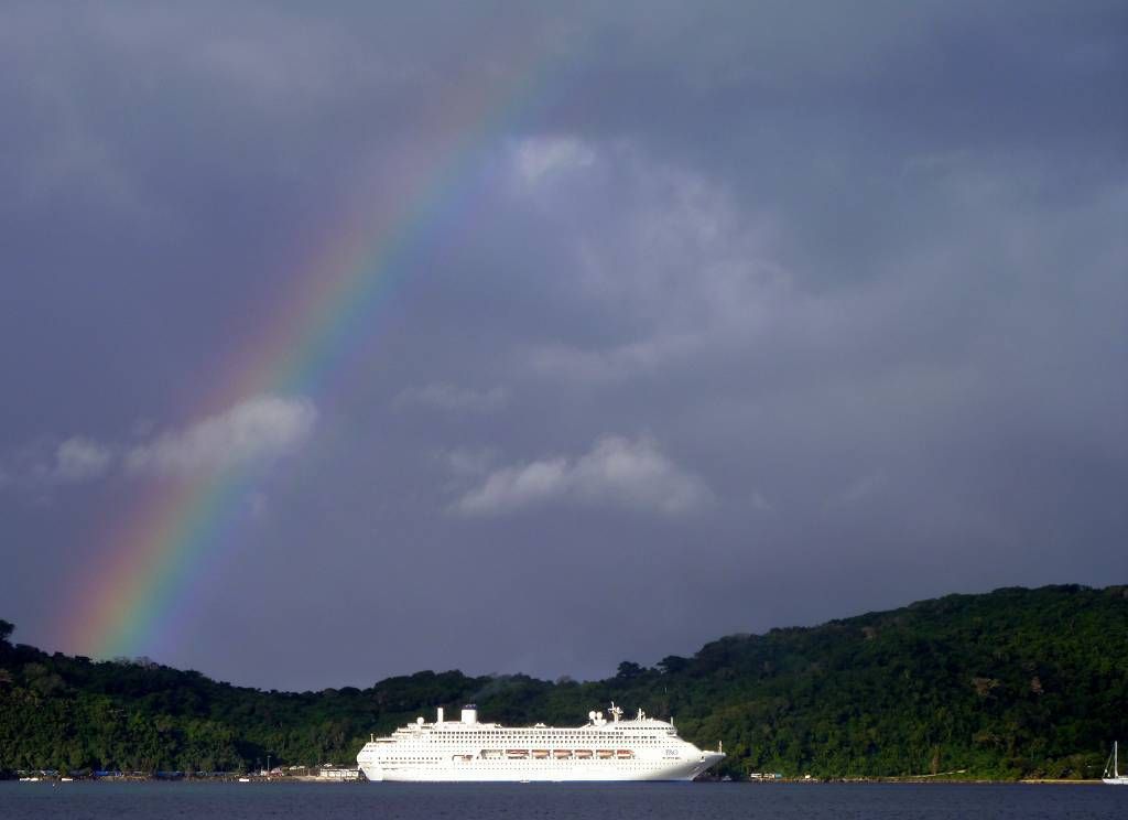 Ein grosses Kreuzfahrtenschiff, die „Pacific Jewel“, ist in der Bucht. Heute ist es nur leicht bewölkt und sehr warm.