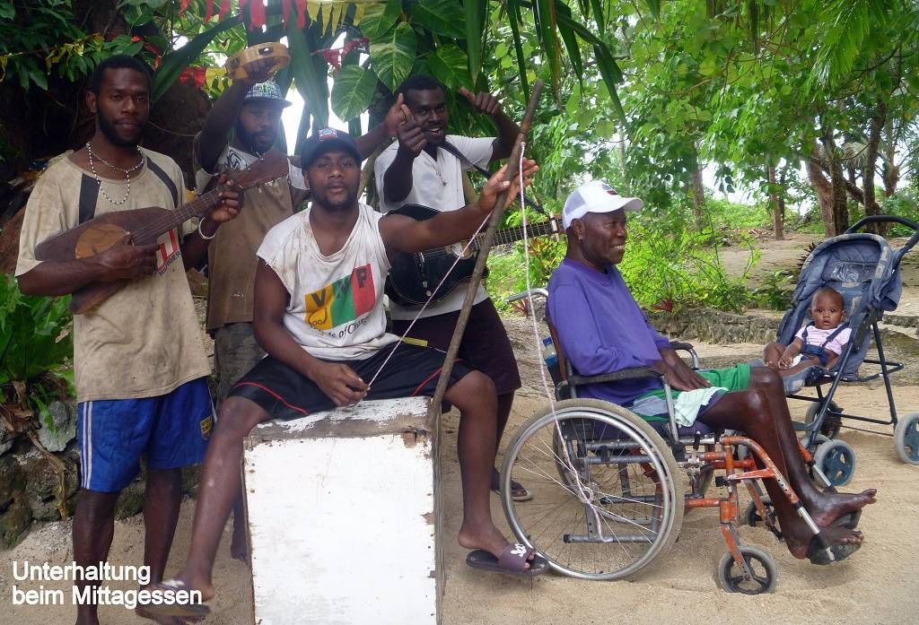 Weiter geht es über den Amerikanischen Flugplatz aus dem 2.Weltkrieg, zum Restaurant (es ist zwar eher eine Hütte) am Strand, wo wir zu Mittag essen. Für unsere Unterhaltung sorgt eine kleine "Band", die Vanuatu-Musik spielt. Das Essen ist nicht so üppig, gut hatten wir vorher noch das feine Erdofengemüse!!! Jetzt gibt es Reis, Poulet, Rindfleisch (ich kann es kaum abeinandersäbeln!) und ein wenig geraffelten Salat (Rüebli oder Kürbis? Wir können es nicht definieren). Zum Dessert Grapefruitstücke. Aber schlecht ist es nicht wirklich. Unterwegs sehen wir dann noch das Wasserreservoir, wo die Amis im Krieg ihr Trinkwasser holten.