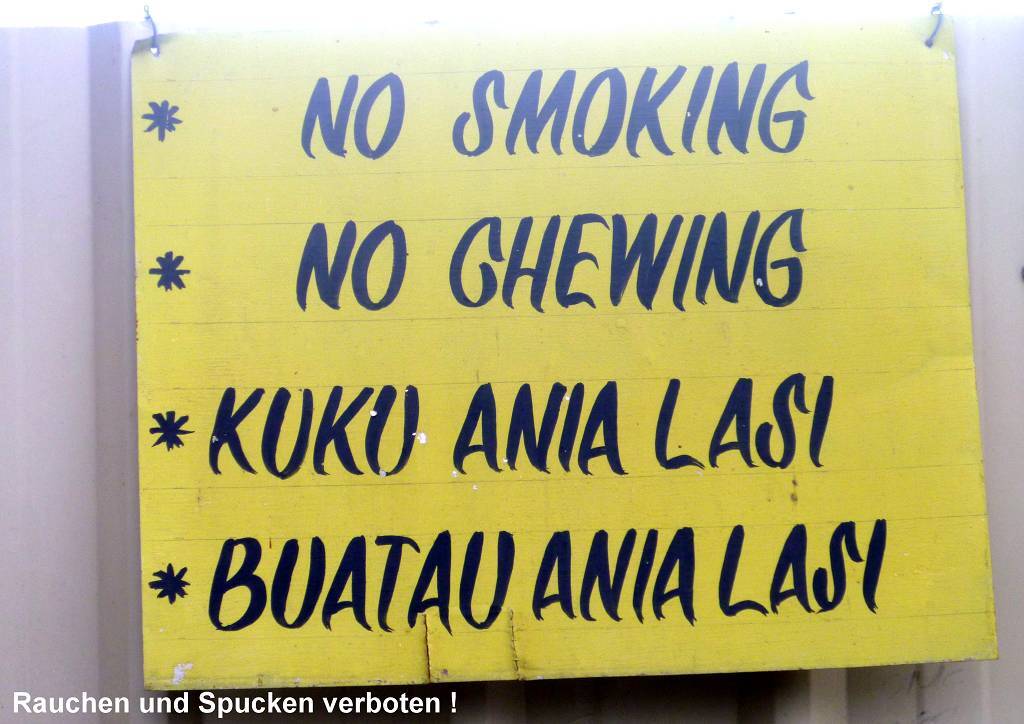 Um 8h50 bin ich bereits im Yacht Club. Ich will die Fotos und ein ganz wichtiges mail versenden. Internet funktioniert immer noch nicht.!!! Dies ist die schlechteste und teuerste (46 SFr. ist das Minimum das man nehmen kann, für 160 MB) Internetverbindung die wir je hatten! Überhaupt dieser Royal Papua Yacht Club ist ganz etwas feudales. Er hat 3600 Mitglieder, 234 Liegeplätze an Stegen, etwa 100 Schiffe sind ständig bewohnt. An jeder Ecke stehen Wachmänner, im und ums Gebäude herum wuselt es nur so von Personal, überall wird geputzt, geglänzt und poliert, ob es schon sauber ist oder nicht. Im Restaurant steht sich das Servierpersonal gegenseitig auf den Füssen herum. Also, eigentlich nicht unsere Welt. Aber dafür ist man hier in diesem Ghetto in „Sicherheit“, rund um die Uhr bewacht! Diese „Sicherheit“ muss aber auch bezahlt werden. Wir liegen zum Beispiel an unserem eigenen Anker im Vorbecken der Marina und wenn wir an Land wollen, müssen wir unser Dinghy nehmen, dafür bezahlen wir pro Tag 54 Kina (etwa 27 SFr.). Dafür dürfen wir in der Marina duschen (Duschenschlüssel bekommt man gegen 100 Kina (46 SFr.) Depot) und Wasser holen. Man bezahlt den Ankunftstag, auch wenn man erst Abends um 17h reinkommt und den Abreisetag ebenso, auch wenn man schon morgens um 9h wegfährt.