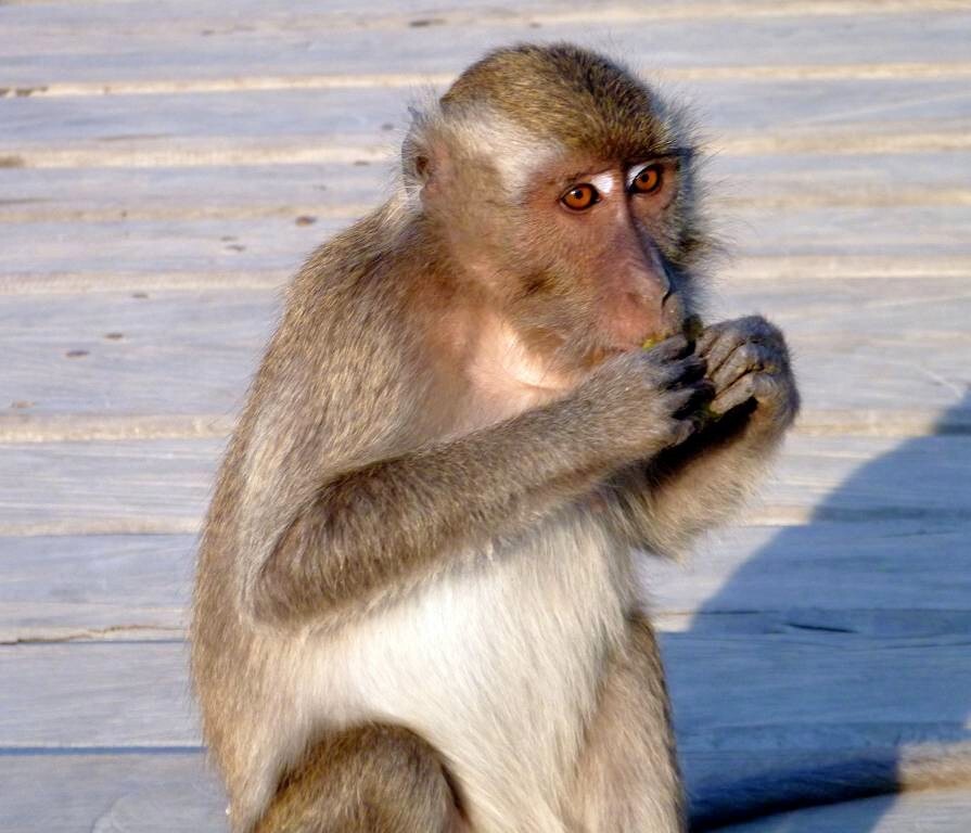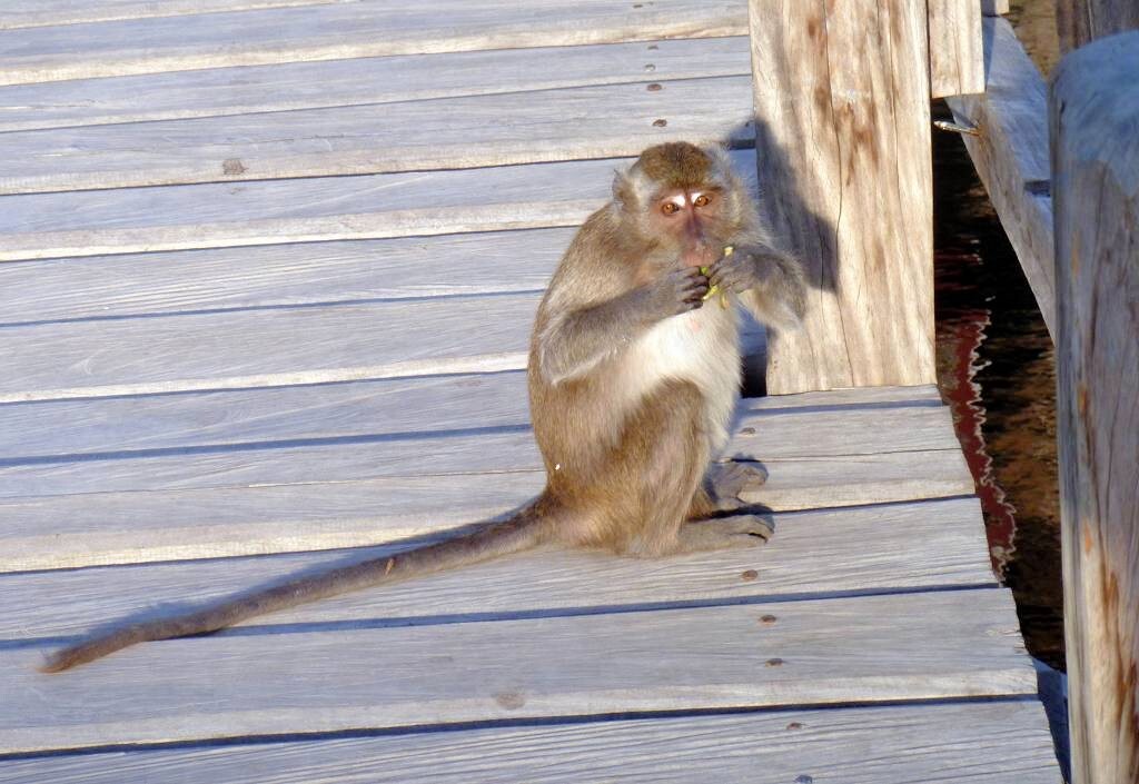 Gegen 15h holen wir Angela und Ian per Dinghy ab und gehen zusammen mit ihnen, „Fee“ und „Y not“ in den Komodo-Nationalpark. Wir wollen uns doch mal diese Urviecher von Waranen ansehen. Der Eintritt kostet für Paul und mich, inklusive einer Kamera 316'000 Rupiah (ca. 31.60 SFr.). Beim Eingang turnen schon die Affen herum. Mit dem Guide Ramlin laufen wir ungefähr 1½ Stunden durch sehr trockenen Wald. Schon beim Rangerhaus, unter dem Küchengebäude, liegen die ersten 7 Warane faul herum. (Männchen)!!! Ich bin sehr enttäuscht. Ich hatte mir etwas Imposanteres, so etwas wie kleine Dinosaurier vorgestellt......