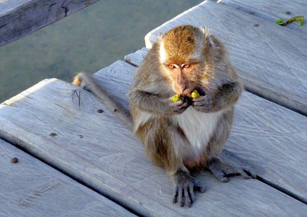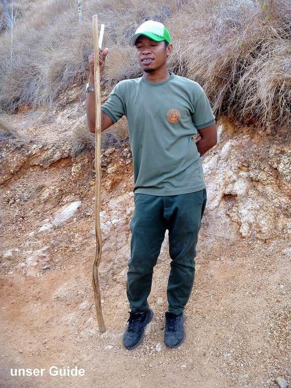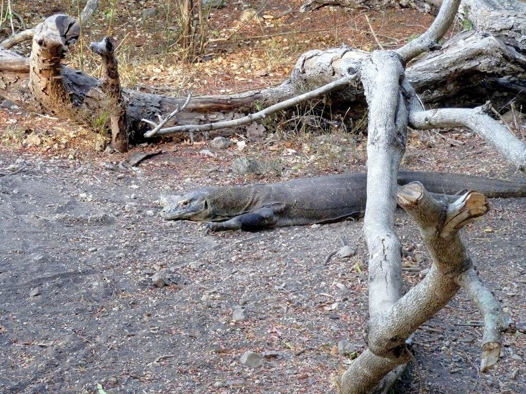 Gegen 15h holen wir Angela und Ian per Dinghy ab und gehen zusammen mit ihnen, „Fee“ und „Y not“ in den Komodo-Nationalpark. Wir wollen uns doch mal diese Urviecher von Waranen ansehen. Der Eintritt kostet für Paul und mich, inklusive einer Kamera 316'000 Rupiah (ca. 31.60 SFr.). Beim Eingang turnen schon die Affen herum. Mit dem Guide Ramlin laufen wir ungefähr 1½ Stunden durch sehr trockenen Wald. Schon beim Rangerhaus, unter dem Küchengebäude, liegen die ersten 7 Warane faul herum. (Männchen)!!! Ich bin sehr enttäuscht. Ich hatte mir etwas Imposanteres, so etwas wie kleine Dinosaurier vorgestellt......