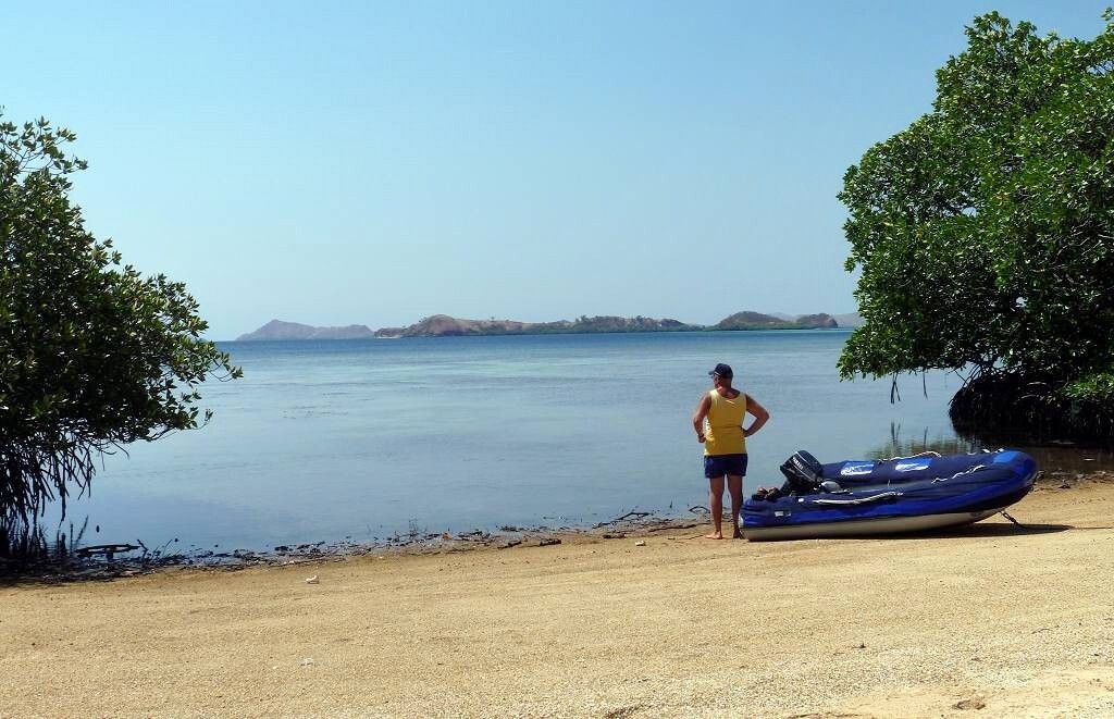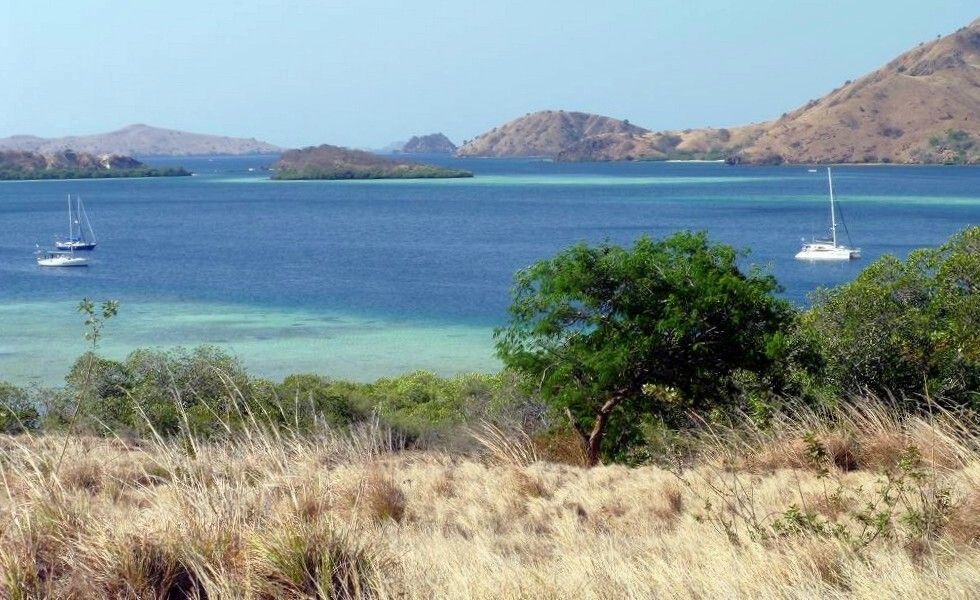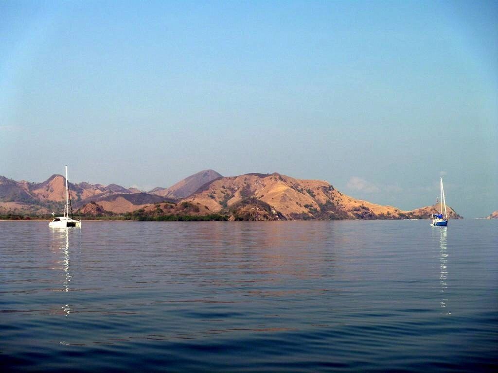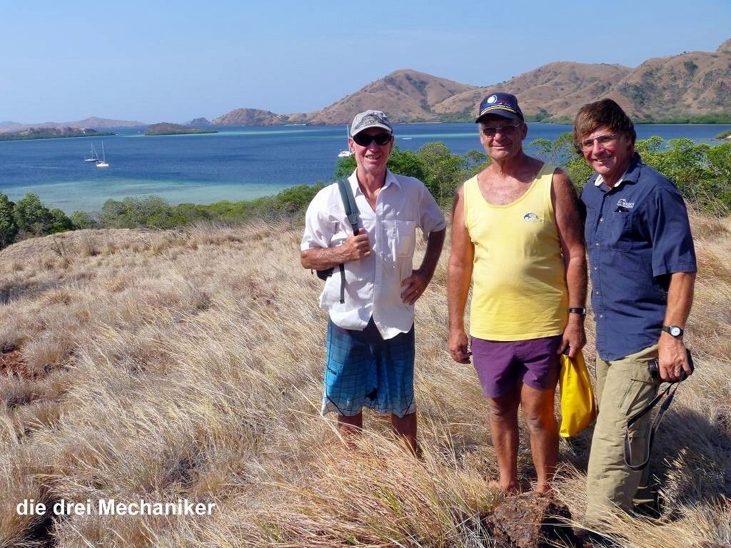 Am Nachmittag gehen wir mit Jim und Peter an Land und machen eine 1½-stündige Wanderung über die staubtrockene Insel. Peter verletzt sich an einem Dorn am Arm und blutet. Hoffentlich zieht er damit keine blutgierigen, menschenfressende Warane an. Es ist heissss.... Wir sehen zwar keine Warane, Wasserbüffel oder Affen, aber dafür ein Reh und zwei Seeadler. Und ausserdem geniessen wir einen wunderbaren Blick von einem erkletterten Hügel auf unsere Schiffe. Toll. Danach ist das Bad im Meer umso herrlicher. Paul entdeckt einen einzelnen Delfin der ganz gemütlich durch die Bucht schwimmt.