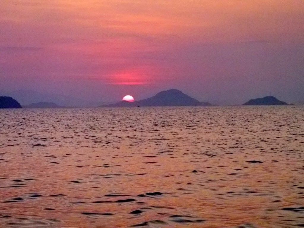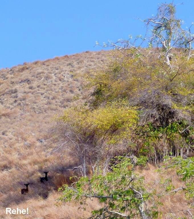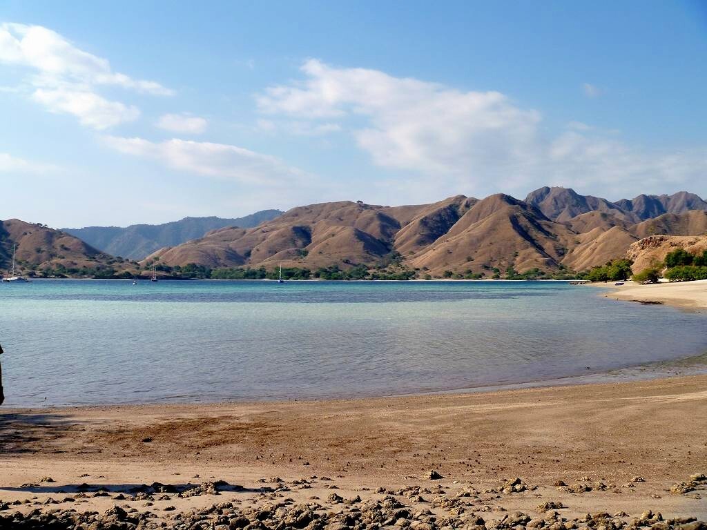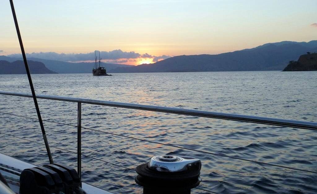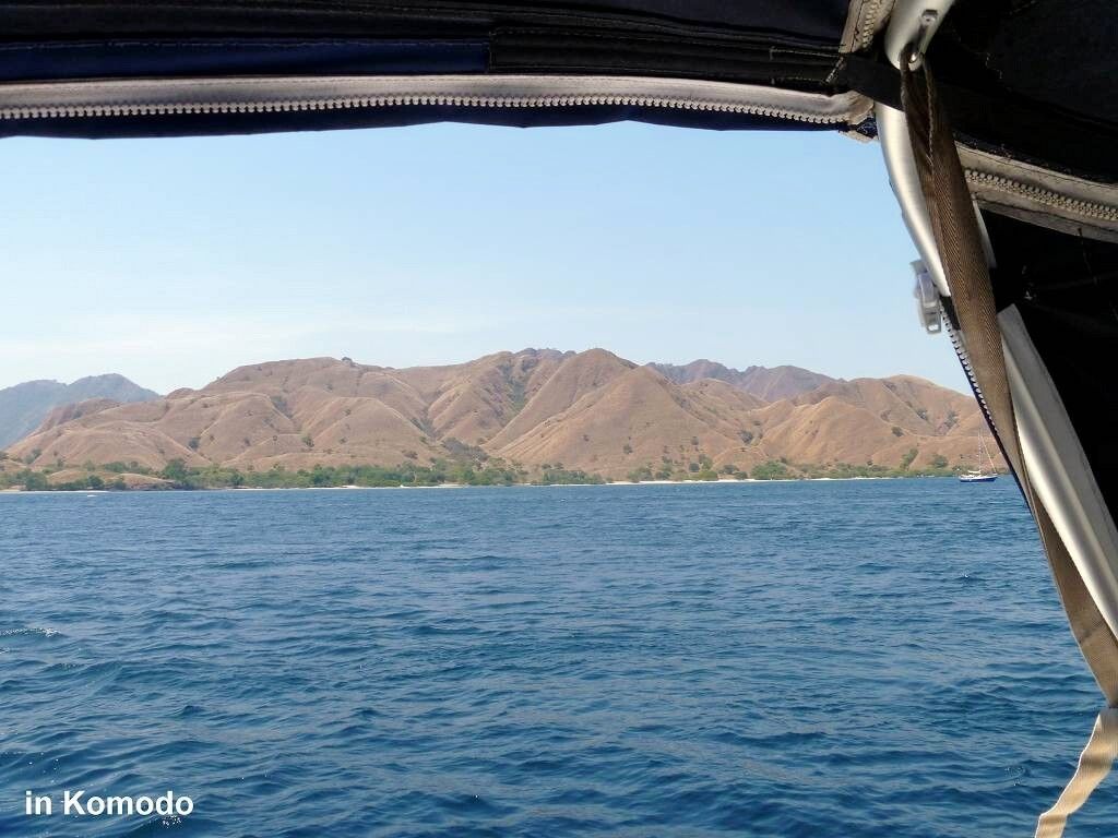 Am Nachmittag gehen wir mit Jim und Peter an Land und machen eine 1½-stündige Wanderung über die staubtrockene Insel. Peter verletzt sich an einem Dorn am Arm und blutet. Hoffentlich zieht er damit keine blutgierigen, menschenfressende Warane an. Es ist heissss.... Wir sehen zwar keine Warane, Wasserbüffel oder Affen, aber dafür ein Reh und zwei Seeadler. Und ausserdem geniessen wir einen wunderbaren Blick von einem erkletterten Hügel auf unsere Schiffe. Toll. Danach ist das Bad im Meer umso herrlicher. Paul entdeckt einen einzelnen Delfin der ganz gemütlich durch die Bucht schwimmt.