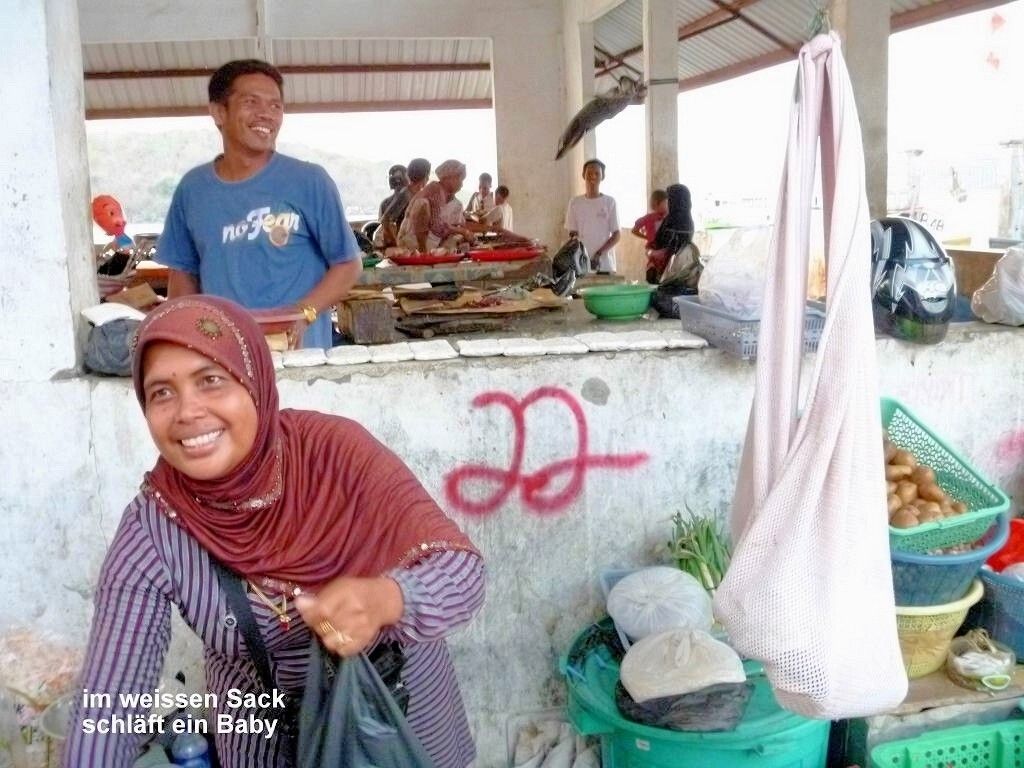 In Labuan Bajo schlendern die anderen sechs durch das Dorf. Paul und ich gehen auf den Markt. Wir brauchen noch Gemüse. Paul feilscht in zähen Verhandlungen um jede Kartoffel (1 kg = 20'000 Rupiah = 2 SFr.), Gurke (1 kg = 10'000 Rupiah = 1 SFr.) oder Tomate (1 kg = 10'000 Rupiah = 1 SFr.). Die Marktfrauen- und Männer haben ihren Spass mit ihm.