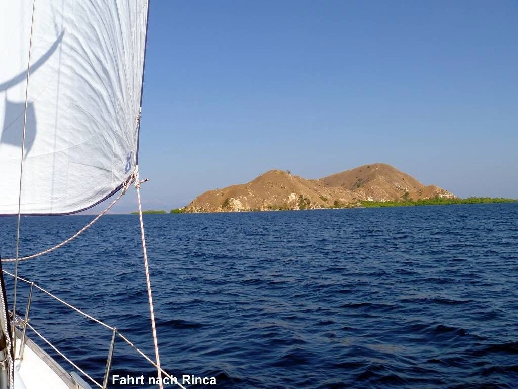 Um 9h fahren wir mit „Island Prism“ und „Persian Sands“ los nach Komodo, zur kleinen Insel Punja. In der ersten Stunde haben wir guten Wind zum Segeln, in der zweiten Stunde haben wir den Wind voll auf die Nase und müssen motoren. Um 12h ankern wir in Komodo, hinter der kleinen Insel Punja. Wir ankern um, weil wir zu nahe an der „Island Prism“ sind.