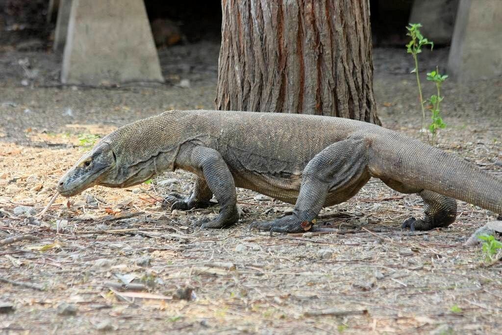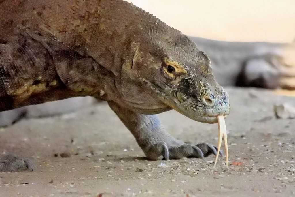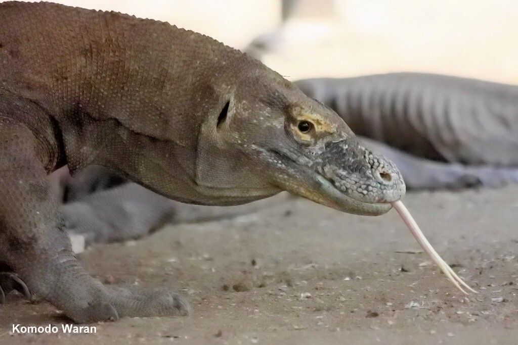 Lebensweise und Gefährlichkeit : Diese grösste lebende Echse ist agil, besitzt ausgezeichnete Sinnesorgane und gilt als eines der intelligentesten Reptilien. Als Geruchsorgan benutzt der Komodowaran seine Zunge. Er lebt in den Wäldern und Buschländern der Inseln und ernährt sich dort unter anderem von Aas (wobei allerdings ein grosser Teil dieser toten Tiere an Waranbissen verendet sein wird), schlägt aber durchaus auch häufig lebende Beute, angefangen von kleinen Reptilien, Vögeln und Säugern, bis hin zu grossen Säugern wie Hirschen, Wildschweinen oder Pferden, die das Gewicht der Warane um ein Vielfaches übersteigen. Selbst vor einem Büffel schreckt er zuweilen nicht zurück. Die kleineren Beutetiere verspeist der Komodowaran im Ganzen. Früher bestand seine Hauptbeute aus heute ausgestorbenen Zwergelefanten, die damals als einzige grosse Säugetiere auf Komodo und den umliegenden Inseln vorkamen.