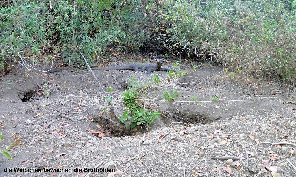 Wir laufen weiter und kommen an die Nester, wo die Weibchen ihre Eier in tiefen Höhlen abgelegt haben. Die Weibchen liegen daneben und bewachen ihre Eier. Auch hier macht sich bei mir Enttäuschung breit. Ich möchte doch gerne so ein Tier herumlaufen sehen!