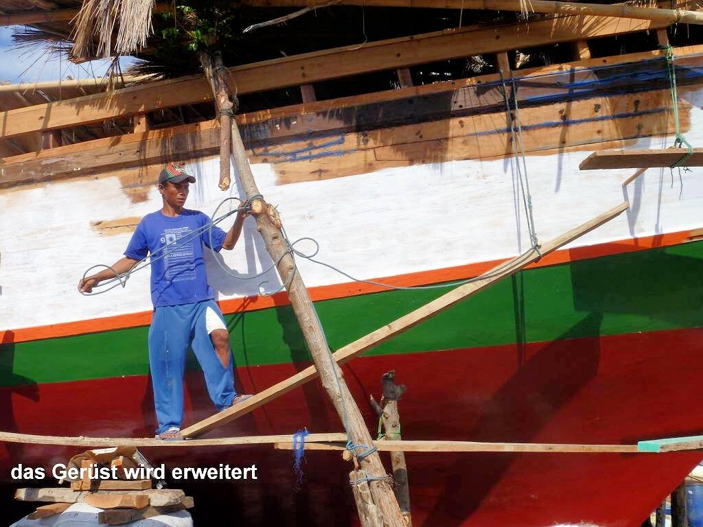 Um 06h ist bereits Tagwache. Weit draussen vor dem Dorf ankert ein grosses Schiff. Vom Dorf her werden mit 3 kleinen Booten Leute und Fracht abgeholt, ins Dorf gebracht und der grosse Kahn fährt weiter. Wir sind um 7h45 schon am schwarzen Sandstrand des Dorfes Wera. Hier werden wir von einem Uniformierten, es ist ein anderer als der von gestern, per Handschlag freundlich begrüsst. Wir spazieren durch das Dorf und schauen uns die Werften an, wo die grossen Holzschiffe mit einfachsten Mitteln hergestellt werden. Das ist sehr interessant. Die Schiffe werden mit Holzzapfen, nur mit ganz wenigen Metallbeschlägen, zusammengebaut. Eindrücklich!