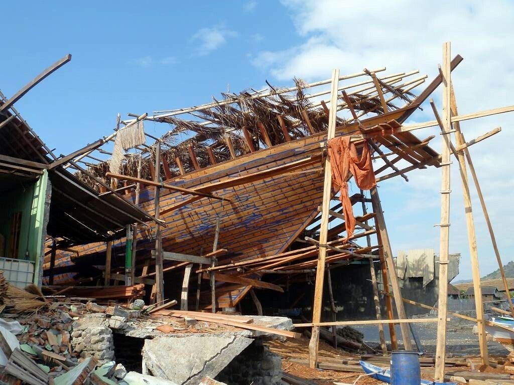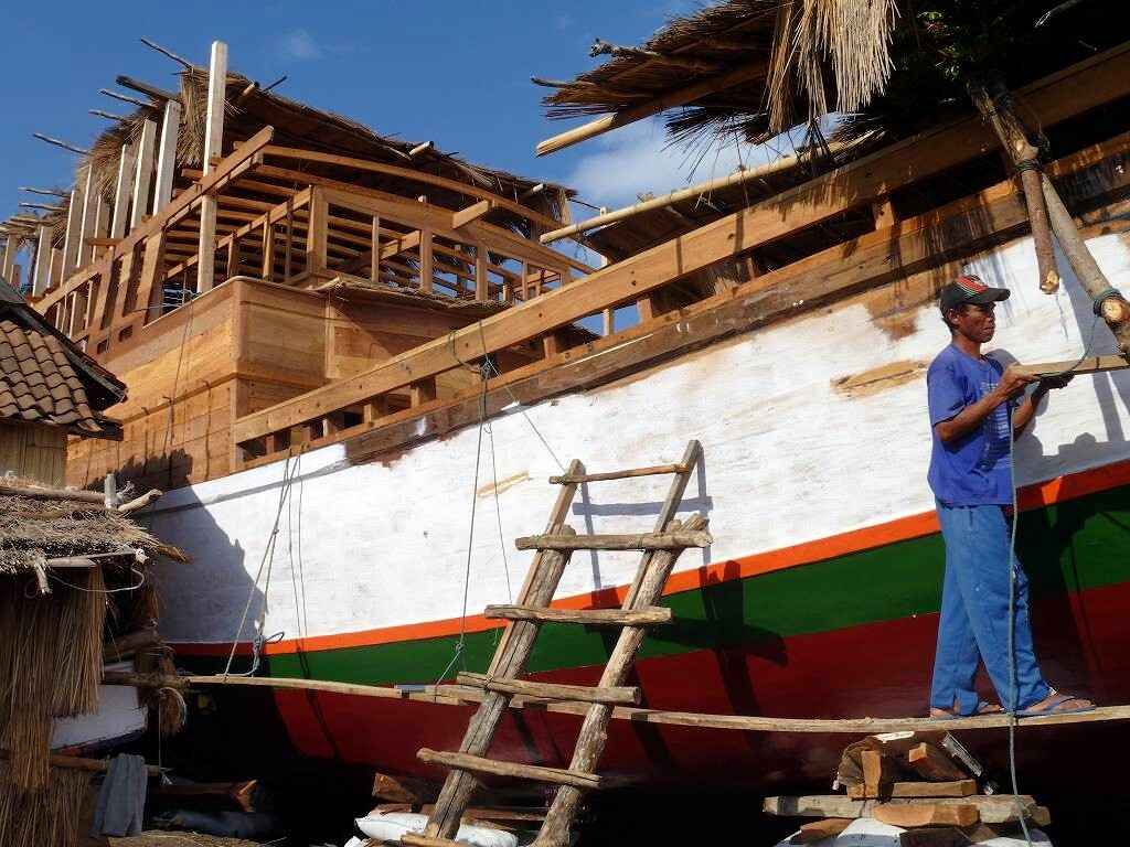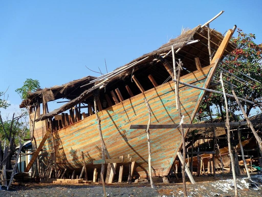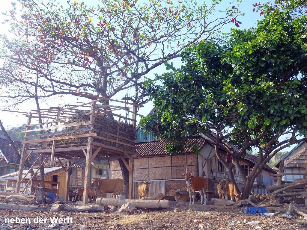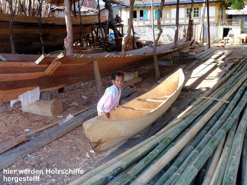 Um 06h ist bereits Tagwache. Weit draussen vor dem Dorf ankert ein grosses Schiff. Vom Dorf her werden mit 3 kleinen Booten Leute und Fracht abgeholt, ins Dorf gebracht und der grosse Kahn fährt weiter. Wir sind um 7h45 schon am schwarzen Sandstrand des Dorfes Wera. Hier werden wir von einem Uniformierten, es ist ein anderer als der von gestern, per Handschlag freundlich begrüsst. Wir spazieren durch das Dorf und schauen uns die Werften an, wo die grossen Holzschiffe mit einfachsten Mitteln hergestellt werden. Das ist sehr interessant. Die Schiffe werden mit Holzzapfen, nur mit ganz wenigen Metallbeschlägen, zusammengebaut. Eindrücklich!