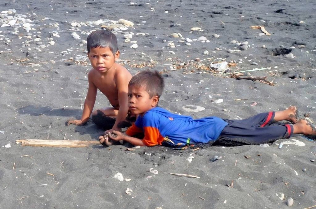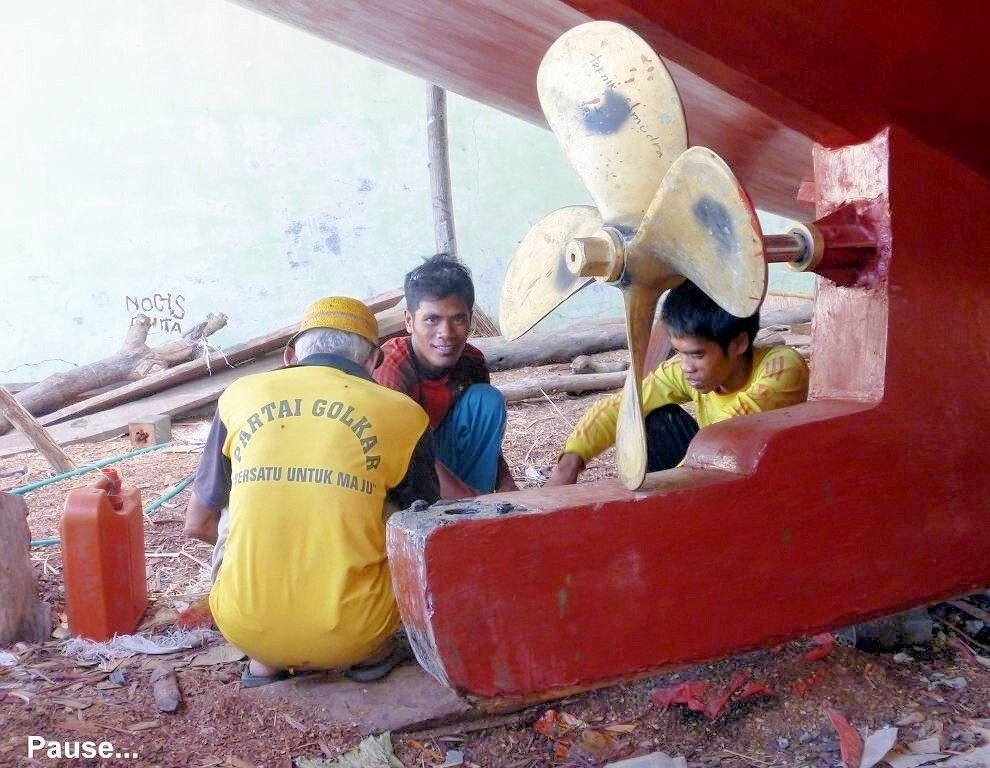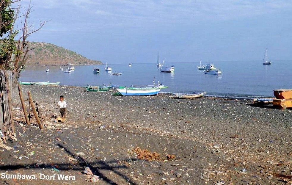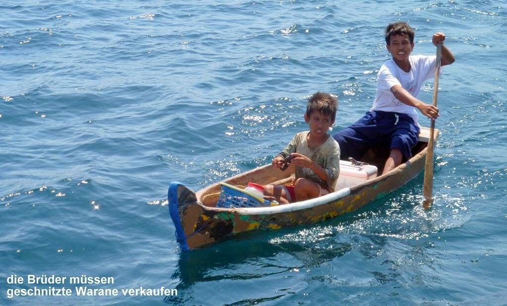 Um 14h30 ankern wir auf der Insel Sumbawa, am schwarzen Sandstrand des Dorfes Wera. In diesem Dorf werden die grossen, bis 30 m langen Holzschiffe hergestellt. Drei Kinder kommen in einem Einbaum angepaddelt. Paul spricht mit ihnen Berndeutsch und schenkt jedem einen Apfel. Zufrieden rudern die drei wieder davon.