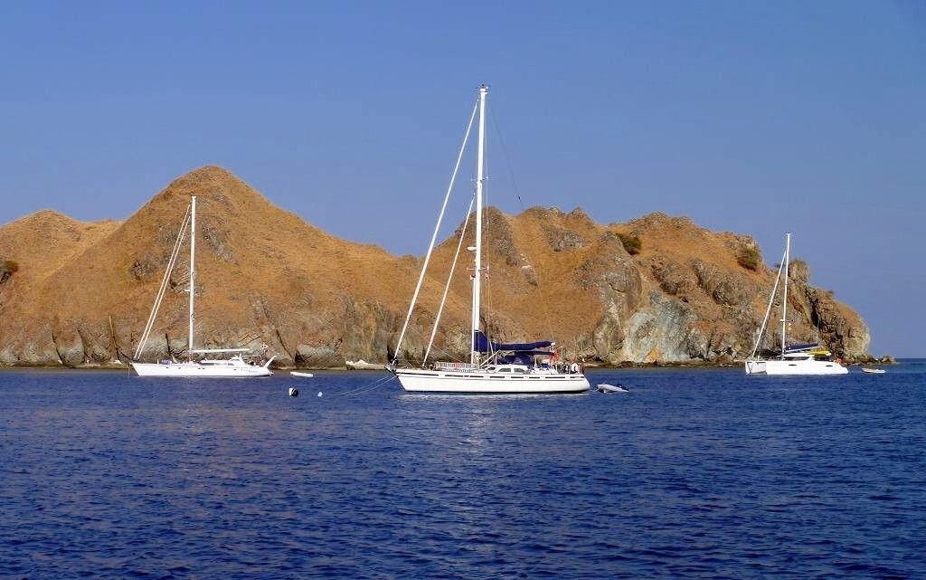 Das Wasser brodelt richtig zwischen den Inseln vor lauter Wind gegen Wellen und Strömung. Die Strömung ist so stark, zum Glück mit uns, dass wir zeitweise 7,5 Knoten schnell fahren. Und das mit nur etwa 8 Knoten Wind. Unglaublich!!! Herrliches Wetter und herrliches Segeln! Um 13h20 kommen wir bei der Insel Gili Lawa an. Die gehört immer noch zum Komodo-Nationalpark.