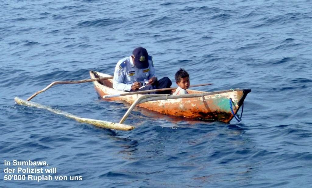Wir sind genau zwei Stunden hier vor Anker, als ein Mann in Uniform mit seinem kleinen Sohn im Einbaum mit Ausleger erscheint. Er schreibt einen Zettel mit der Zahl 50'000 Rupiah, und dem Namen MABUHAY drauf, knallt einen schönen Stempel drauf und will von uns die 50'000 Rupiah haben (5 SFr.). Wir lehnen dankend ab und schenken dem Kind einen Apfel. Wir sagen dem Mann, dass wir morgen in sein Dorf kommen werden und er empfiehlt uns den Markt und die Schiffswerften. Der Uniformierte paddelt nicht sehr erfreut davon. Wir wissen nicht mal, von welchem Amt der kommt, aber er hat viele imponierende Abzeichen auf seinem Hemd. Paul möchte auch so ein Hemd haben...