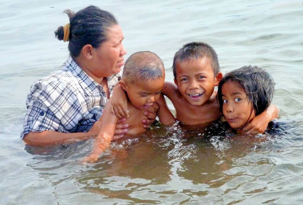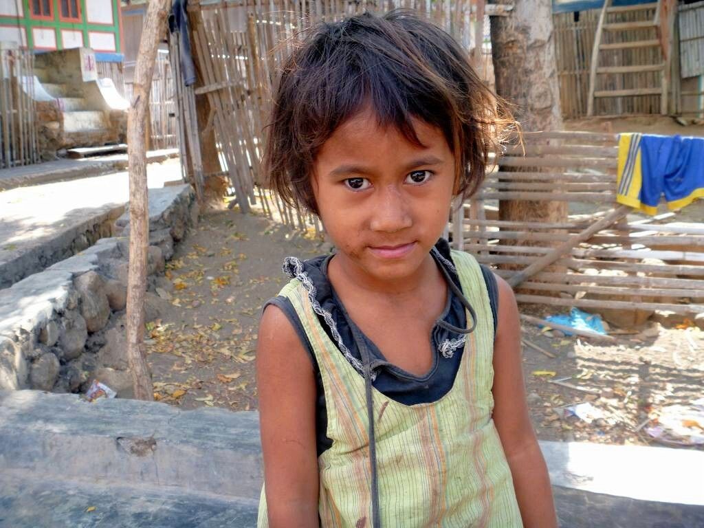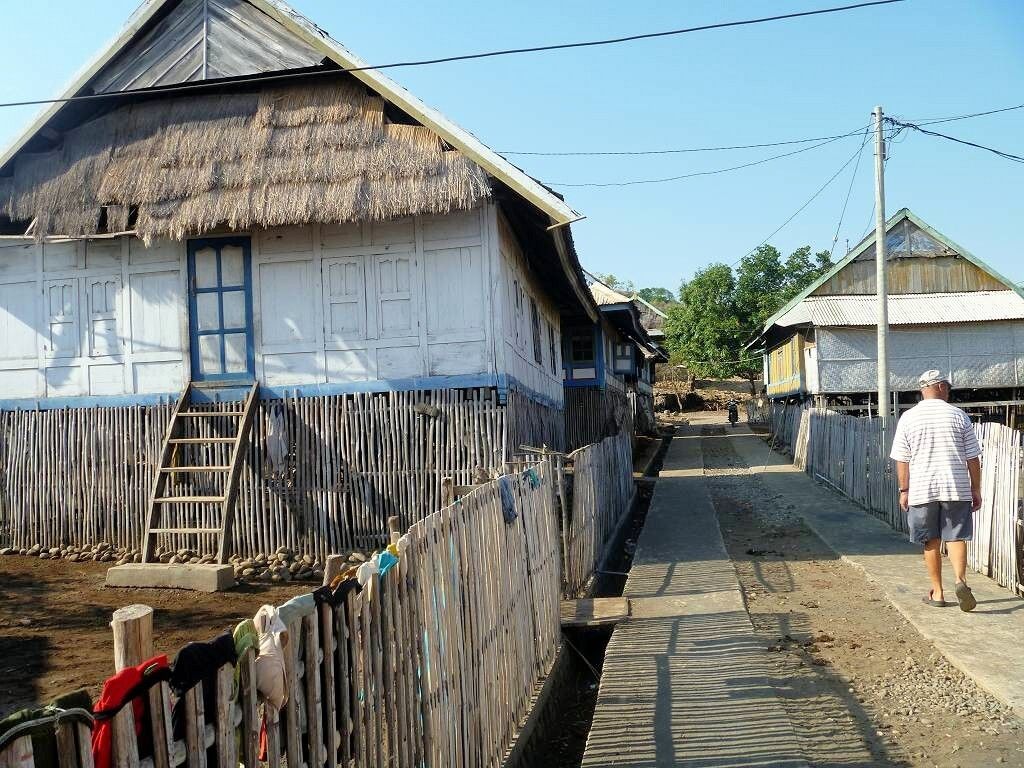 Im Dorf wollen mir Frauen Sarongs (Tuch für einen Rock), die sie zu Hause weben, verkaufen. Aber was soll ich mit einem karierten Sarong, den ich garantiert nie benützen werde? Das Dorf mit vielen Kindern, Ziegen, kleinen Kühen und Hühnern ist „relativ“ sauber. Als wir in unser Dinghy einsteigen wollen kommt Mister Uniform und hält uns einen handgeschriebenen Zettel vor die Nase. Er will von uns 50'000 Mäuse haben. Wir lehnen wieder dankend ab und steigen in unser Dinghy.