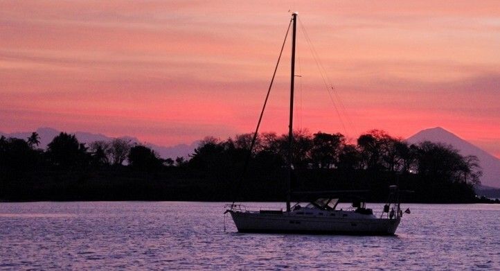 Um 9h20 verlassen wir die unruhige Ankerbucht und segeln weiter nach Westen. Dabei sehen wir auf der Wasseroberfläche eine grosse schwarz-weiss gebänderte Seeschlange.