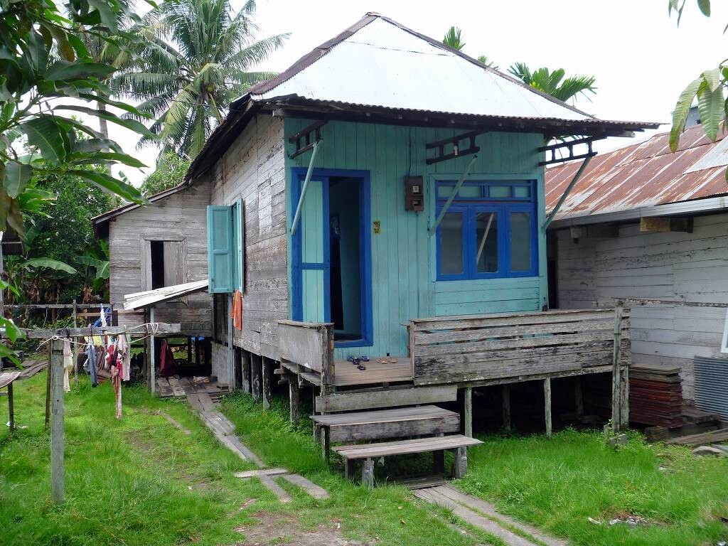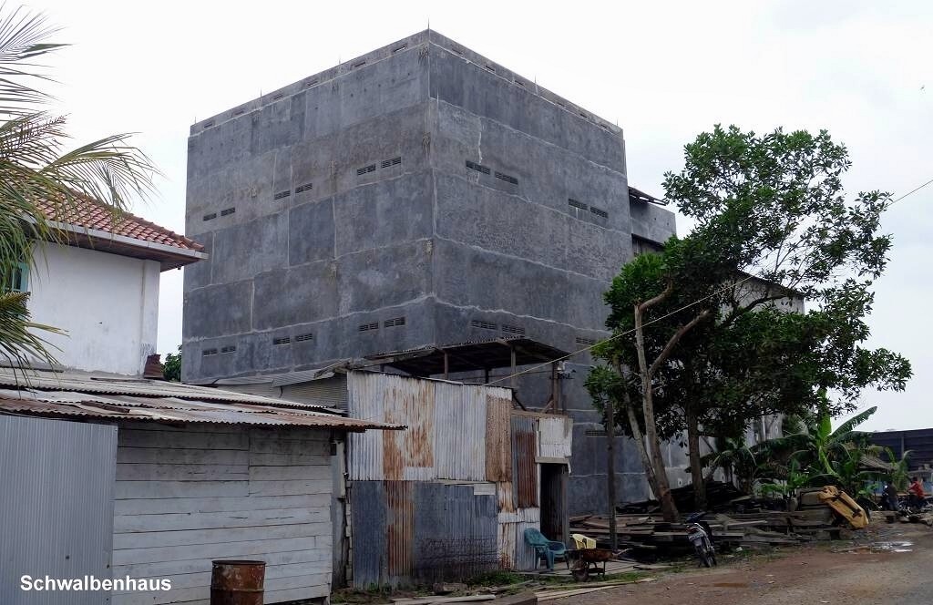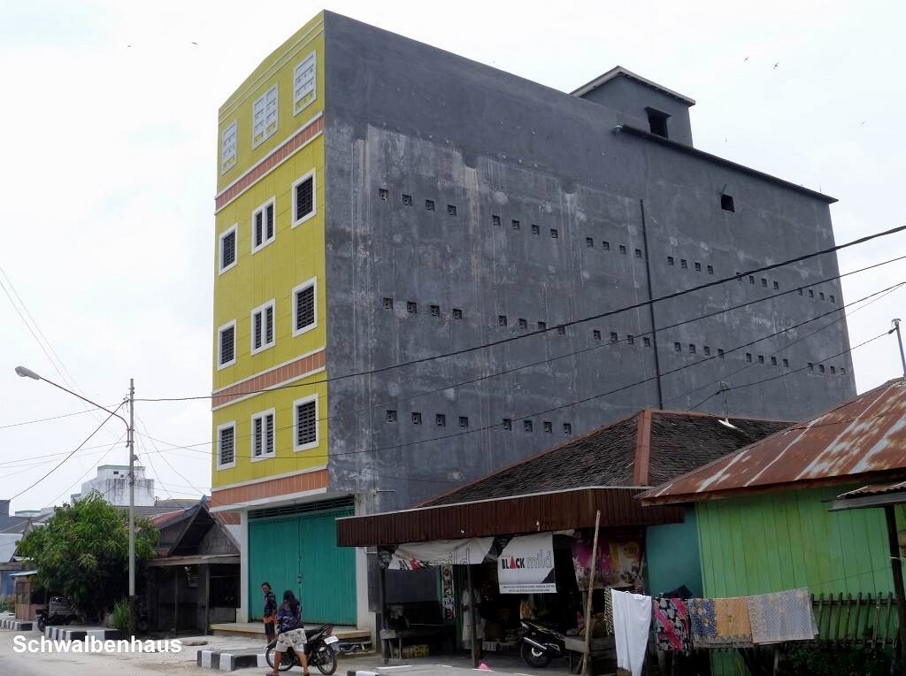 Kumai ist nicht wirklich ein schöner Ort. Es hat viele hohe Betongebäude, die aussehen wie Bunker. Sie haben keine Fenster, höchstens ein paar aufgemalte. Wir fragen den Chauffeur, was da drin gelagert wird. Die Antwort überrascht uns ziemlich: Schwalben sind da drin. Die produzieren die heiss begehrten Schwalbennester für die Chinesen, die daraus Suppe kochen. Aha! Und wirklich hört man bis über den Fluss das Gekreische von Vögeln.