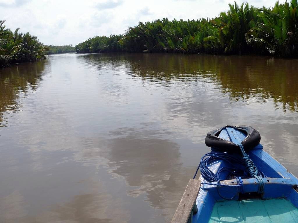 Um 8h werden wir von unserem „Klotok“, dem Holzschiff, das uns in den Tanjung Puting Nationalpark, zu den Orang Utans bringen wird, abgeholt. Auf den ersten Blick sind wir von dem Schiff ziemlich entäuscht und geschockt. Es sieht ziemlich „basal“ aus und nicht so bunt angemalt wie alle anderen Klotoks. Und vor allem sieht es nicht so schön aus wie im Internet, wo Penny und Peter die Tour gebucht haben (www.borneotour.org). Aber alles ist blitzsauber und der Motor läuft zuverlässig. Auf der „Persian Sands“ und auf der MABUHAY wird je eine einheimische Wache abgeladen, die 3 Tage auf die Schiffe aufpassen wird.