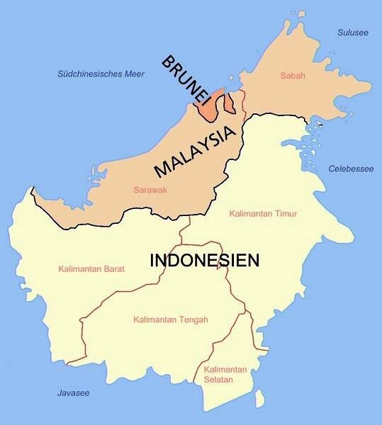 Borneo ist politisch geteilt in das Sultanat Brunei, die malaysischen Teilstaaten Sarawak und Sabah und die indonesische Provinz Kalimantan. Borneo ist damit die einzige Insel, die zu drei Staaten gehört