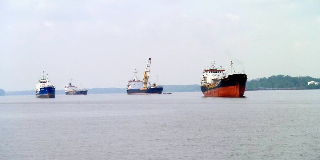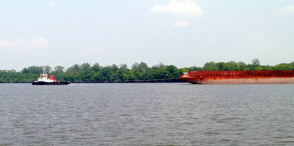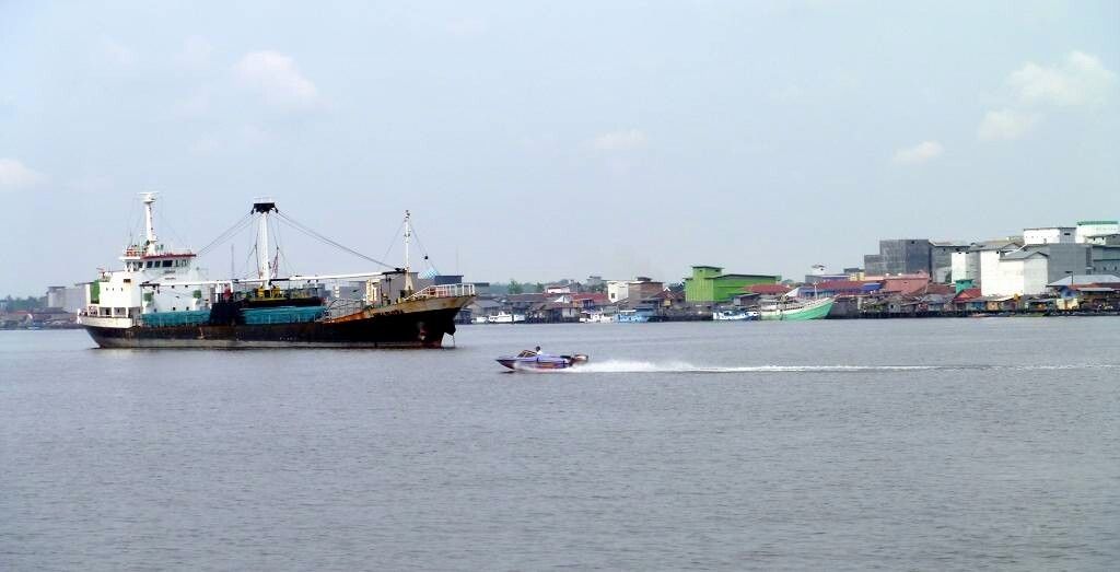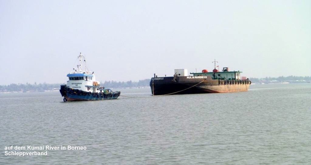 Um 7h fahren wir los. Oder ist es etwa erst 6h? Wir wissen es nicht so ganz genau. Unsere schlauen Bücher sind sich da nicht so ganz einig. Seit Lombok, also seit 5 Tagen sehen wir erstmals wieder ein Segelschiff. Es ist die „Liberté“, Australier, die wir kennen. Die Sonne scheint, aber wir sehen immer noch kein Land. Scheinbar ist die Südküste von Borneo eher flach, viel Sumpfgebiet. Wir sind kaum gestartet, stellen wir den Motor wieder ab. Ein Schleppverband, ein Schleppboot, das einen riesigen Kasten an einem langen Drahtseil hinter sich herschleppt, kommt herangetuckert. Wir warten, um ihm den Vortritt zu lassen. Aber er ist so langsam, dass wir nach einer halben Stunde den Motor wieder starten und weiterfahren. Die Sicht ist sehr schlecht, diesig/neblig. Der Fluss hinauf nach Kumai ist riesenbreit, etwa 4 km!Je näher wir der Stadt kommen, desto mehr von den Schleppkästen hat es und wir müssen ausweichen.