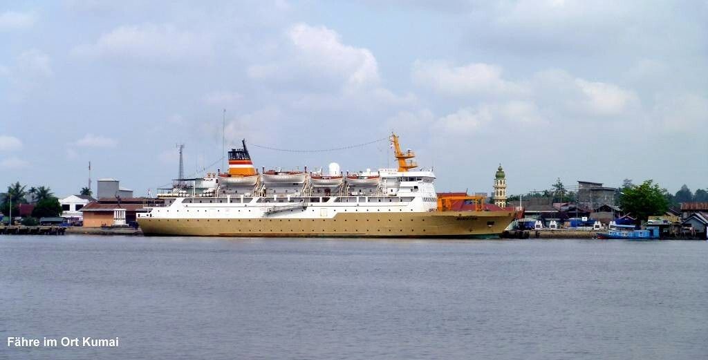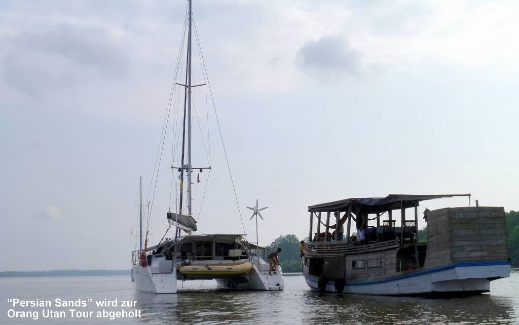 Um 11h40, nach genau 453 sm oder 840 km seit Lombok, ankern wir auf ca. 12 m Tiefe im Fluss vor der Stadt Kumai. Es sind etwa 20 Segelschiffe hier. Sofort ist ein Touranbieter zur Stelle um uns zu den Orang Utans zu bringen. Nach zähen Verhandlungen beschliessen wir, am Freitag mit Penny und Peter von der „Persian Sands“ einen 3-tägigen Affen-Ausflug in den Tanjung Puting Nationalpark zu machen. Die „Persian Sands“ hatten diesen Ausflug im Internet gebucht, nun freuen sie sich, dass wir ihnen helfen, die Kosten zu teilen. Wir hätten nicht diesen Anbieter gewählt.
