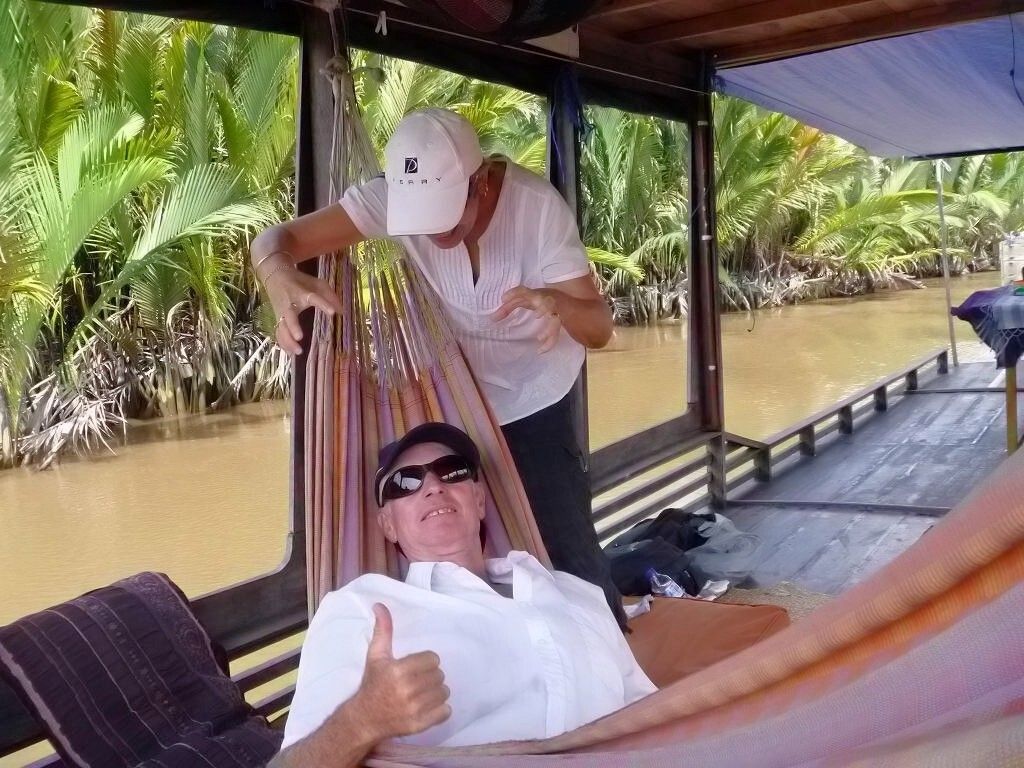 Um 8h werden wir von unserem „Klotok“, dem Holzschiff, das uns in den Tanjung Puting Nationalpark, zu den Orang Utans bringen wird, abgeholt. Auf den ersten Blick sind wir von dem Schiff ziemlich entäuscht und geschockt. Es sieht ziemlich „basal“ aus und nicht so bunt angemalt wie alle anderen Klotoks. Und vor allem sieht es nicht so schön aus wie im Internet, wo Penny und Peter die Tour gebucht haben (www.borneotour.org). Aber alles ist blitzsauber und der Motor läuft zuverlässig. Auf der „Persian Sands“ und auf der MABUHAY wird je eine einheimische Wache abgeladen, die 3 Tage auf die Schiffe aufpassen wird.