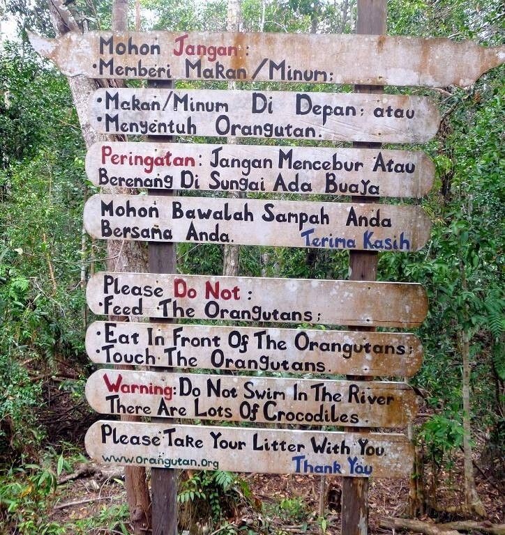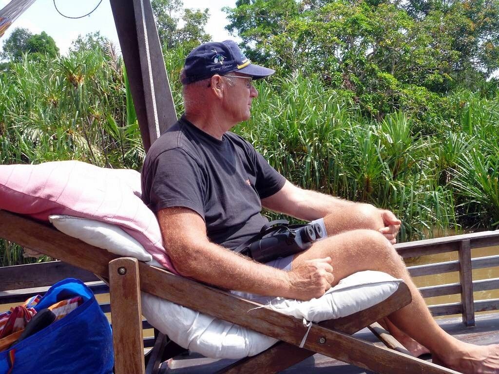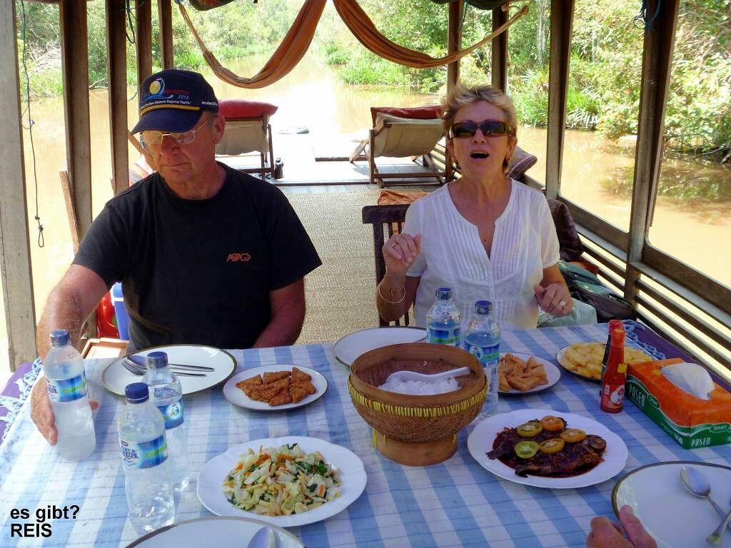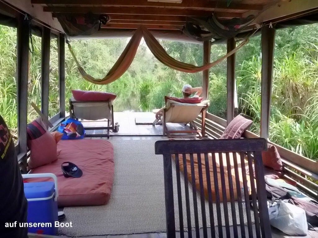 Wir haben eine 4-er Crew. Tinny, die Köchin, Badol der Kapitän, Achim sein Assistent und Iim unser Guide, der Englisch spricht. Wir bekommen ein absolutes Verbot in den Fluss zu springen: Krokodile!!! Wir tuckern 5¼ Stunden den Sekonyer River, einen Seitenarm des Kumai Rivers hinauf. Die Fahrt ist wunderschön und entspannend. Als erstes sehen wir eine kleine Wasserschlange, einen sehr eleganten Silberreiher, einen wunderschönen Vogel mit einem blauschillernden Schnabel und dann die ersten Affen. Zweimal einen Orang Utan in Freiheit, dann eine ganze Horde Nasenaffen (Mann, sind die hässlich!), dazu viele Langschwanz Makaken.