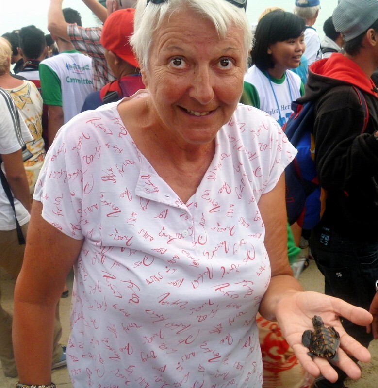 Nachmittags um 13h fährt ein Boot auf die Hauptinsel, zur Massenhochzeit. Um 15h werden die Schildkröten freigelassen. Wir müssen uns entscheiden was wir wollen, beides geht nicht. Paul und ich beschliessen, die Schildchrötli auf den Weg zu schicken. Weil der Regent, irgend so ein Stadtpräsident, von der Hauptinsel noch nicht da ist, werden wir mit schöner Musik und Gesang unterhalten. Ein mächtiges Gewitter braut sich zusammen. Paul und andere Segler eilen per Dinghy auf die Schiffe, um alle Luken und Fenster zu schliessen. Die Musikband schafft schleunigst ihre elektronischen Geräte in die „Dining Hall“ ans Trockene. Und schon geht der heftige Regen los. Nach 1½ Stunden hört er endlich wieder auf und der Regent erscheint. Jetzt dürfen die über 200 Stück, 3 Monate alten Schildkrötli ins Meer entlassen werden. Jöhhh, sind die herzig, die kleinen Krabbler!!!