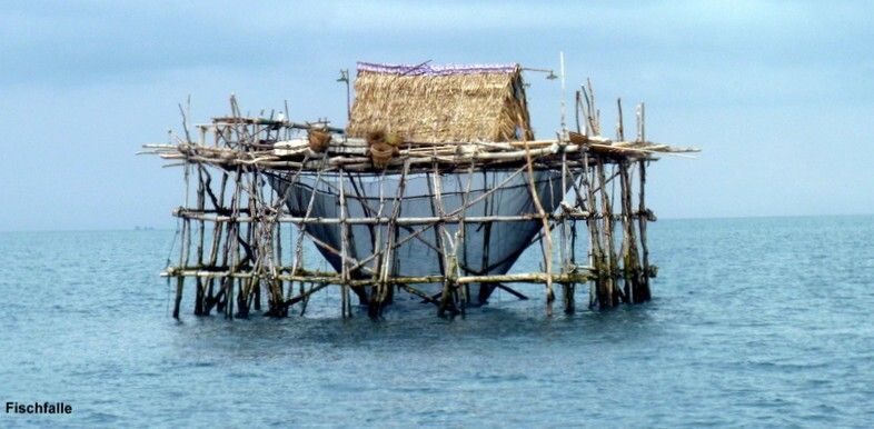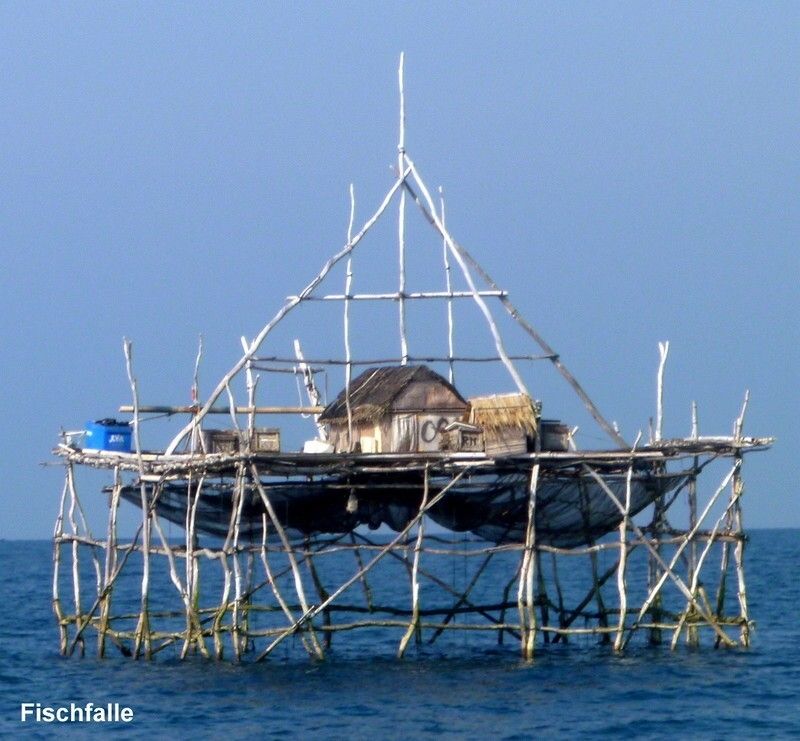 Wunderschöner Sonnenaufgang und sehr schönes Wetter. Als es hell ist, und zum Glück erst dann, hat es auf ca. 10 m Wassertiefe Hunderte von Fischfallen mit einem Häuschen obendrauf, wo zum Teil Leute wohnen. Solche haben wir bis jetzt noch nie gesehen. Aber dafür sieht Paul eine Riesenschildkröte abtauchen.